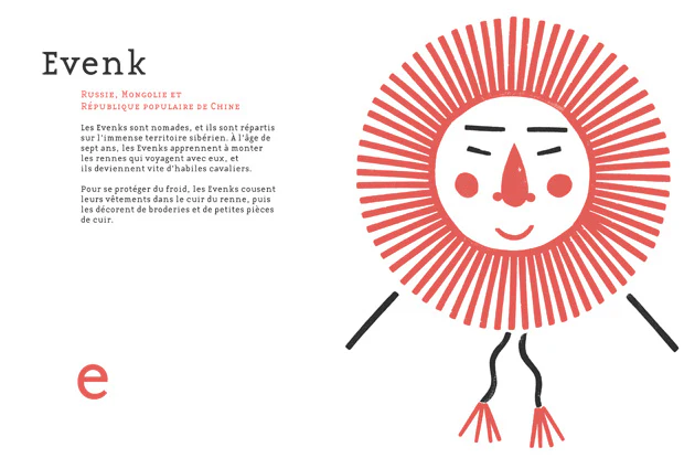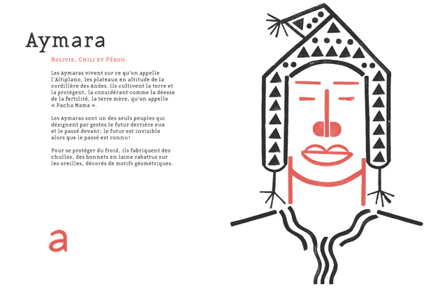 Chaque lettre de l’alphabet est associée à un peuple, avec une présentation de son mode de vie et illustrée par un visage formé de tampons de couleurs. Une carte à la fin du livre permet de placer les peuples qu’on a découvert.