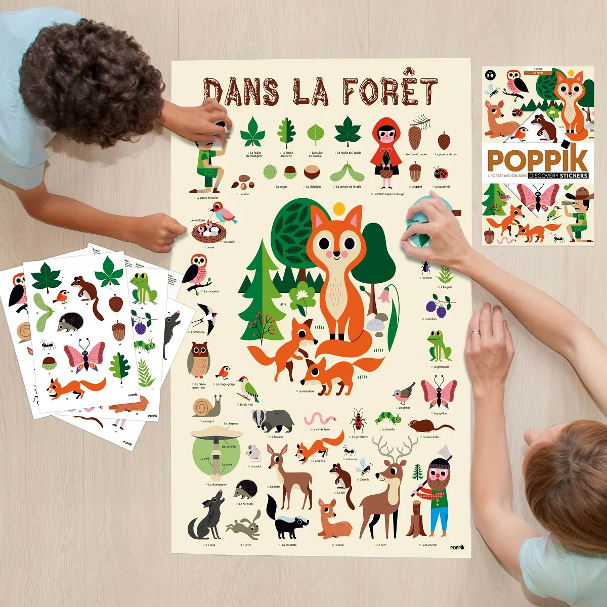 Avec ce poster pédagogique, les enfants se passionnent pour le monde de la forêt : les feuilles des arbres, les animaux, les insectes, les champignons. Les enfants collent les stickers sur le poster géant, et reconstituent ainsi une très belle affiche.