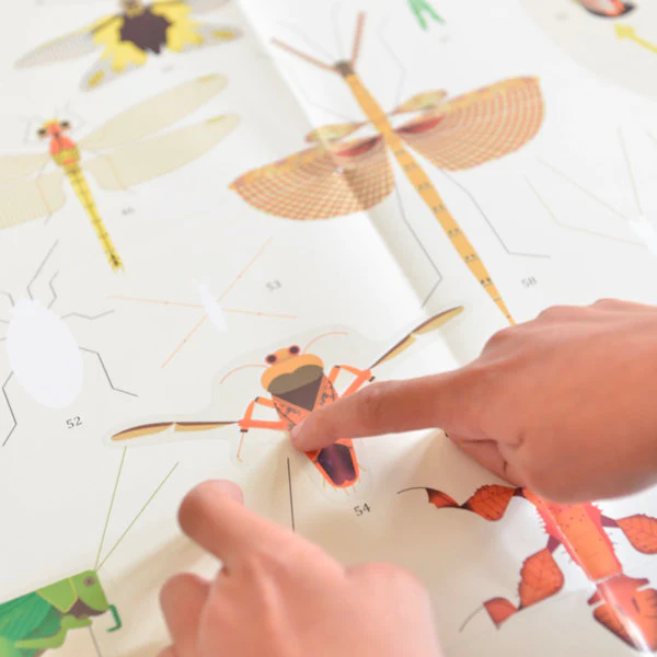 Avec ce poster, les enfants se passionnent pour les insectes. Ils collent les stickers sur le poster, et découvrent les grandes familles enthomologiques… Le résultat: Une très belle affiche pour la chambre!