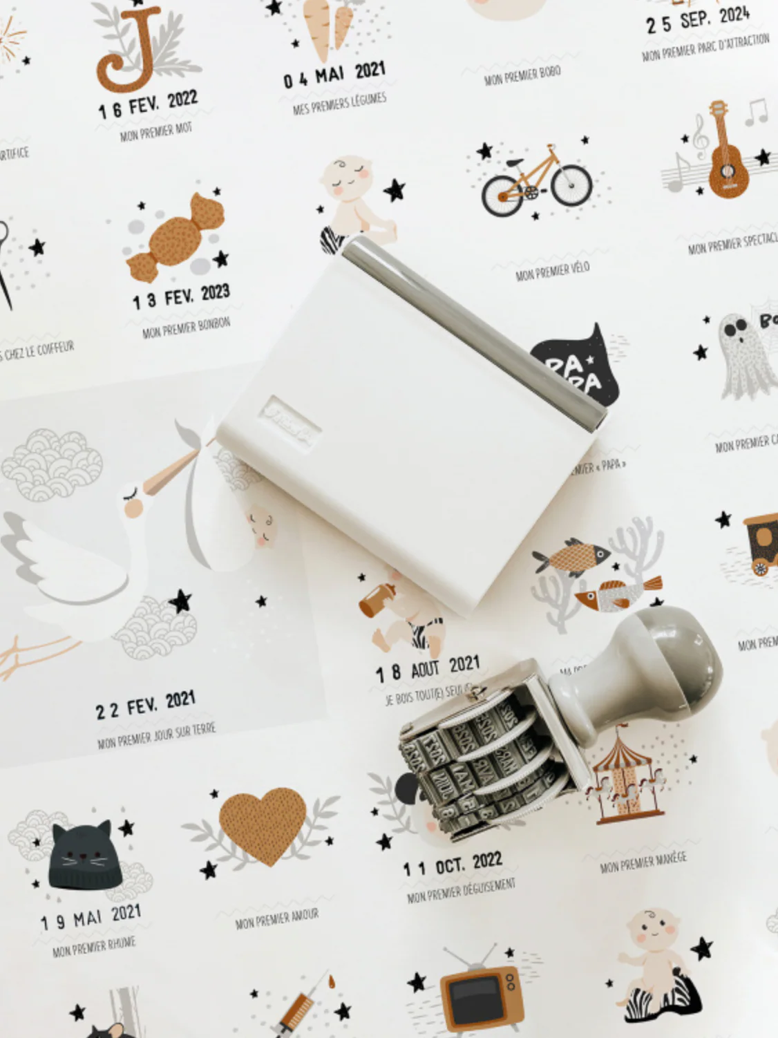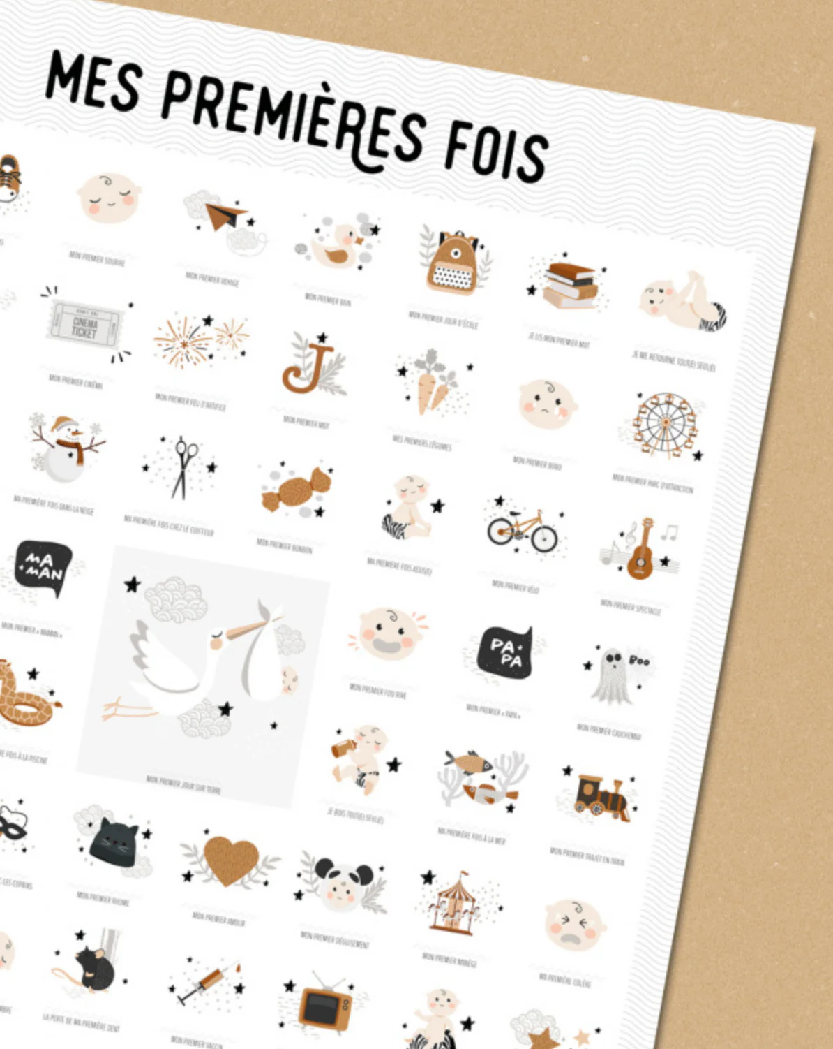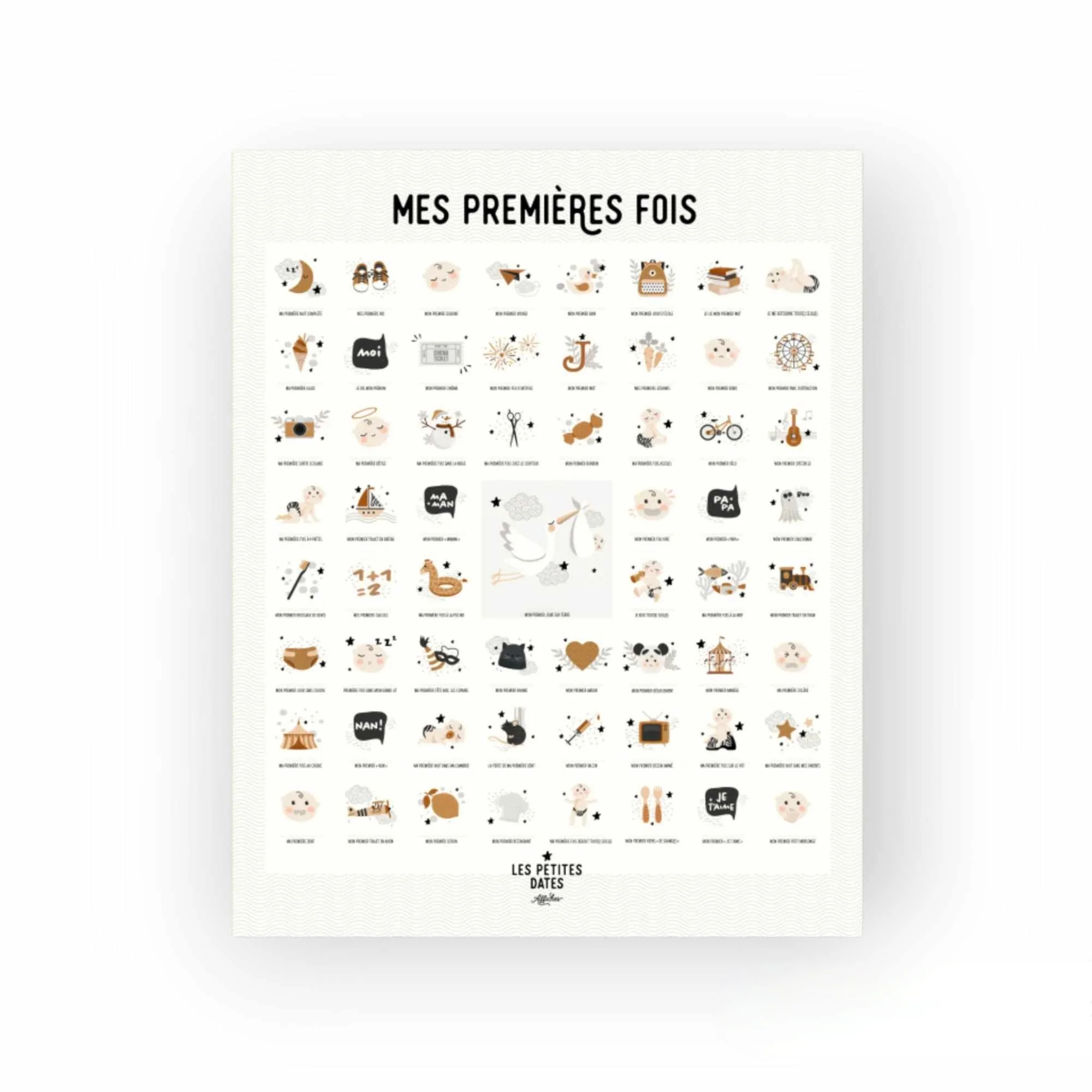 Entre le « premier jour sur terre » et « mon premier trajet en avion »… L’affiche comprend 61 premières fois pour accompagner la vie de votre mini de 0 à 7 ans ou plus, avec le tampon dateur fourni !