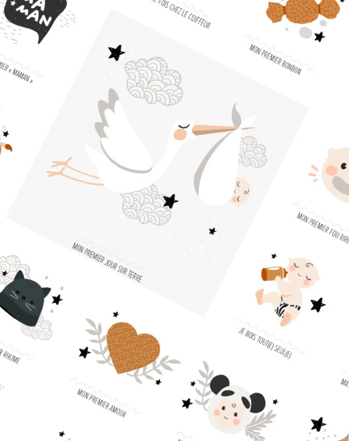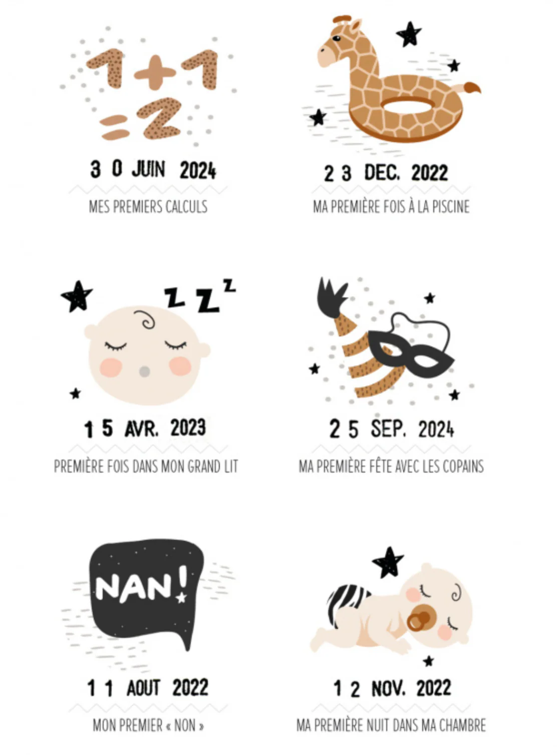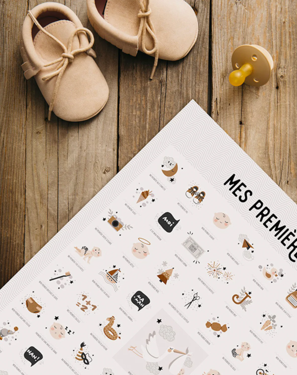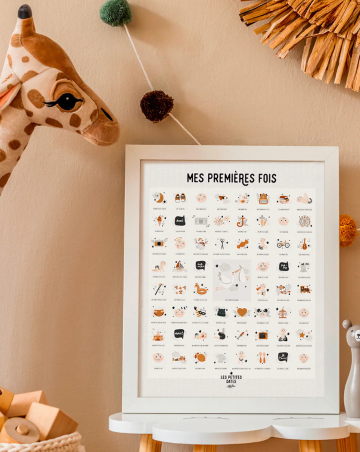 Entre le « premier jour sur terre » et « mon premier trajet en avion »… L’affiche comprend 61 premières fois pour accompagner la vie de votre mini de 0 à 7 ans ou plus, avec le tampon dateur fourni !