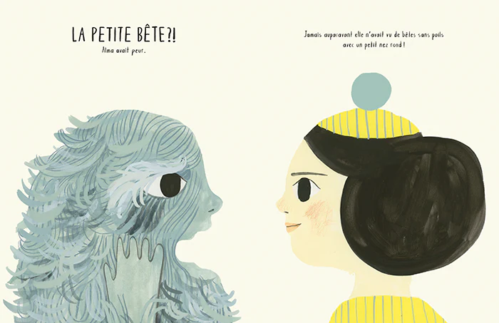 Alma est heureuse dans son monde merveilleusement poilu, où elle passe ses journées à tresser les arbres, peigner l’herbe, caresser le toit de sa maison et nourrir son papidoodle de tulipes-déjeuner. Mais un jour, une étrange créature débarque dans son jardin — une bête chauve au petit nez rond ! D’abord effrayée, Alma comprend vite que la bête est perdue… et décide de l’aider à retrouver le chemin de sa maison toute lisse.