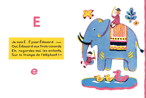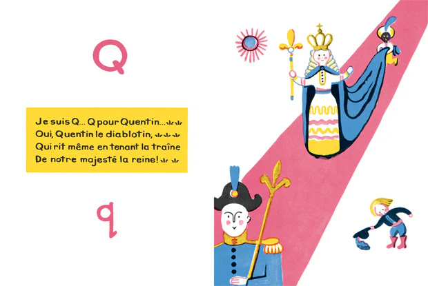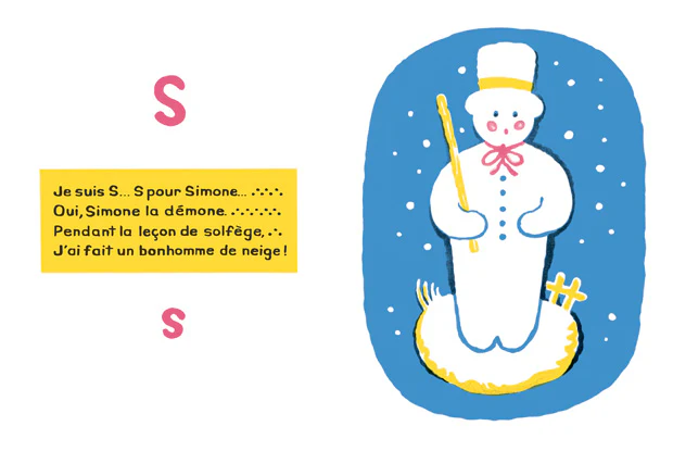 Albert ouvre le livre : A comme Albert, le nez en l’air. B comme Benoît, Benoît sur sa coque de noix. Et ainsi jusqu’au Z : Zoé au Zoo, qui parle aux animaux.