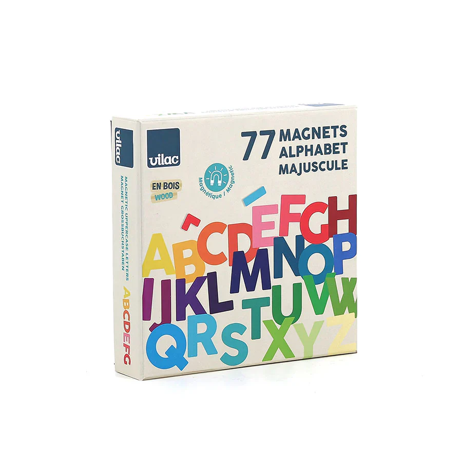 Un jeu d’aimants en bois représentant les lettres majuscules pour aider votre enfant à découvrir l’alphabet.