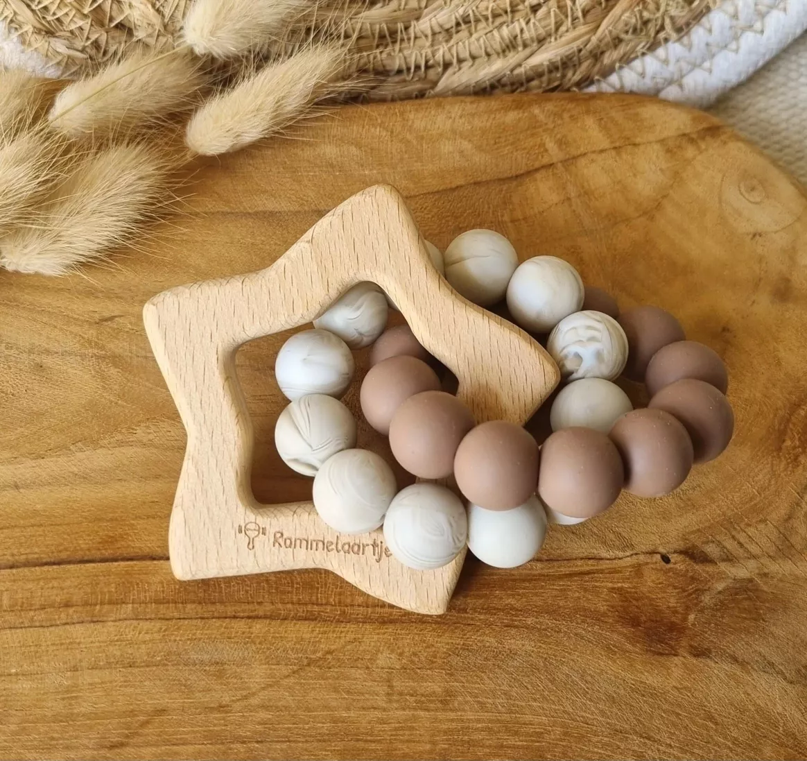 Offrez à votre tout-petit un moment de jeu et d’éveil avec ce magnifique anneau de dentition ! Il est composé de deux anneaux en silicone marbré, aux teintes marron et beige, fabriqués à partir de silicone souple pour soulager les gencives pendant la dentition. L’anneau en bois de hêtre, en forme d’étoile, apporte une texture et une prise supplémentaires pour une expérience sensorielle enrichissante.