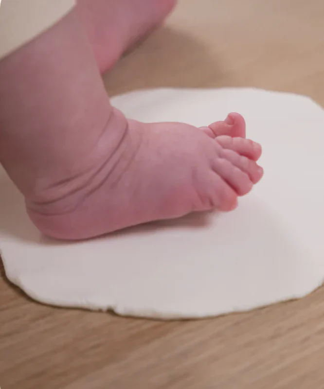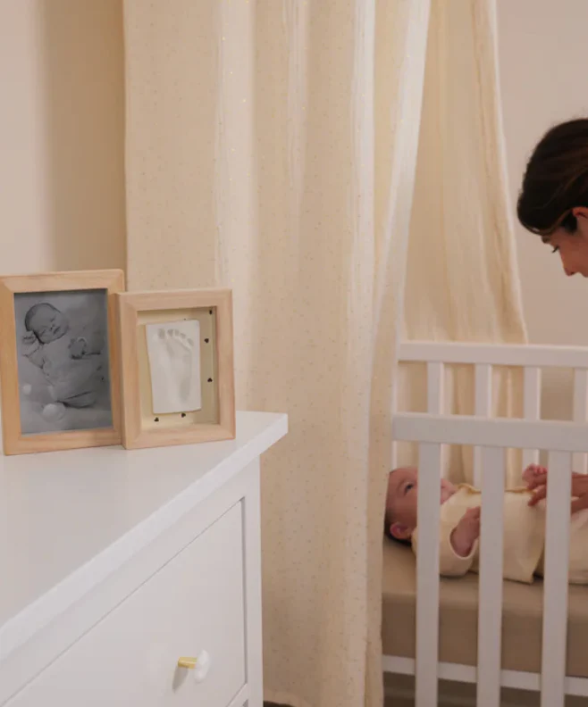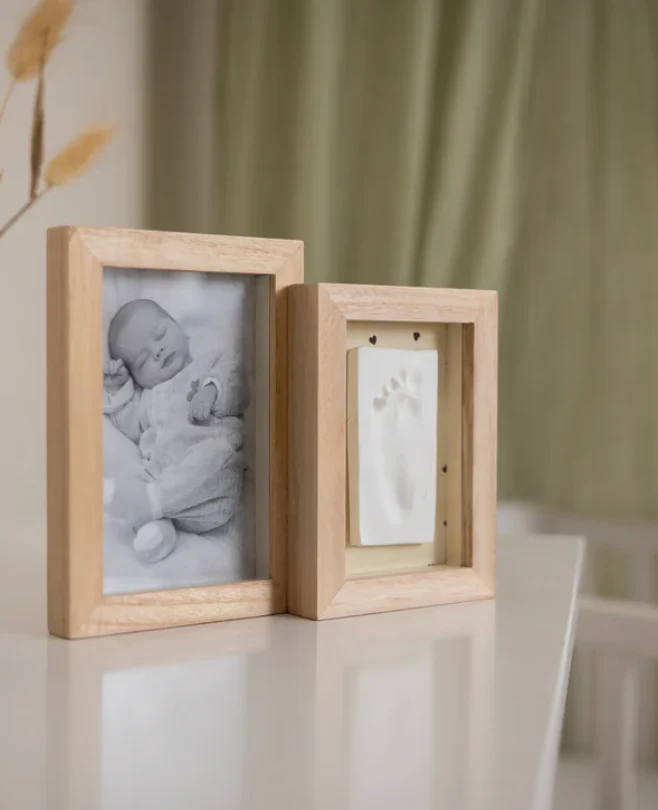 Le cadre empreinte associe harmonieusement empreinte et photo de bébé. Ce cadre à poser ajoute une touche de charme à la décoration avec son fond recto verso de couleur beige avec ou sans motifs coeurs. Le kit comprend de l’argile hypoallergénique, un rouleau et un descriptif pour créer facilement l’empreinte de votre mini.