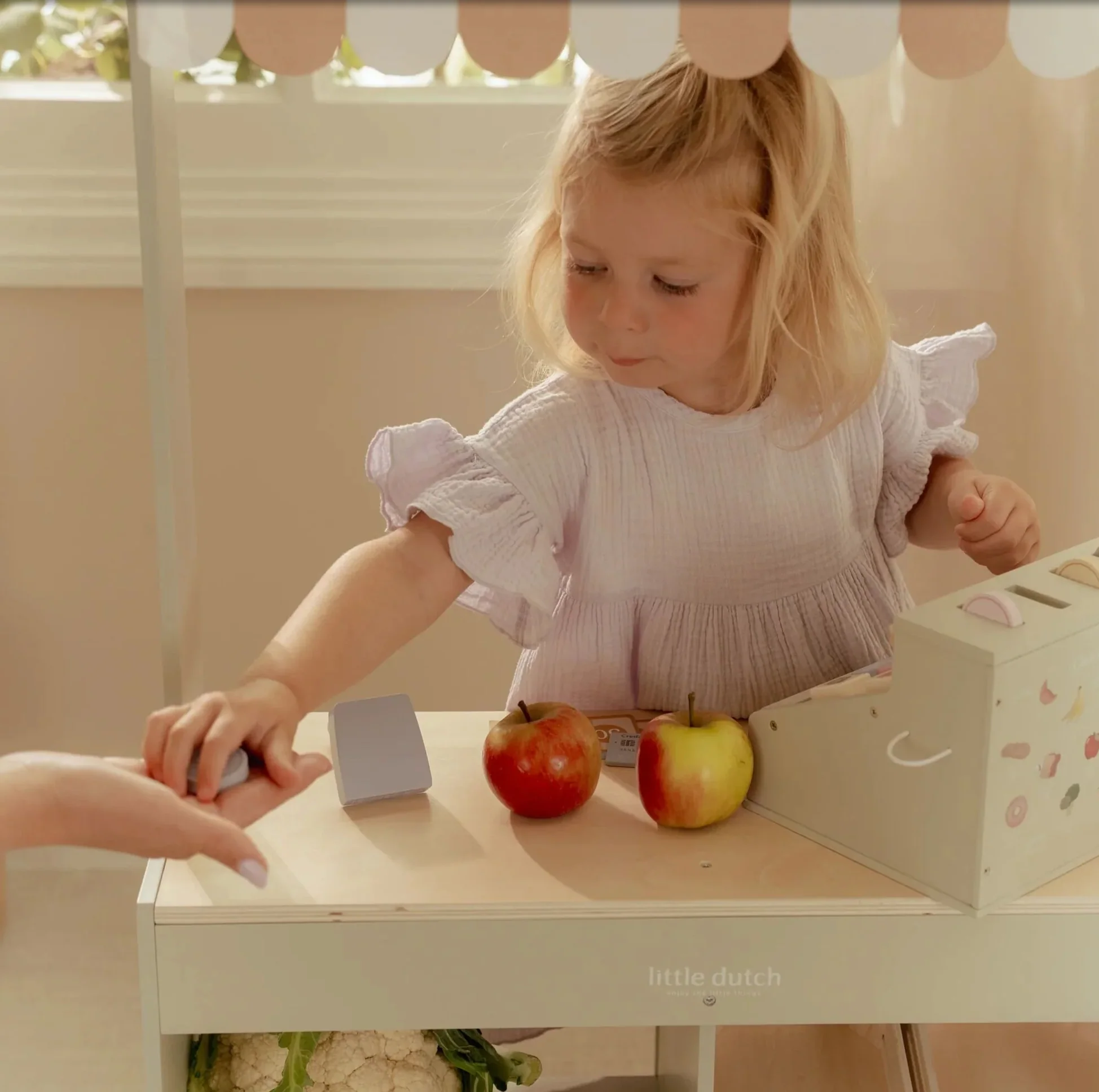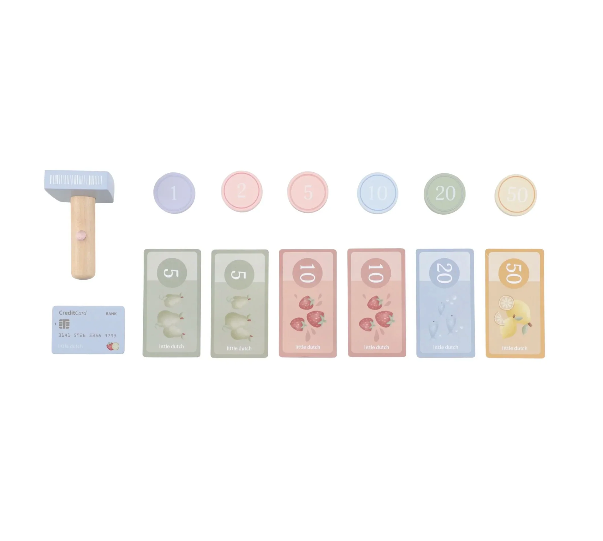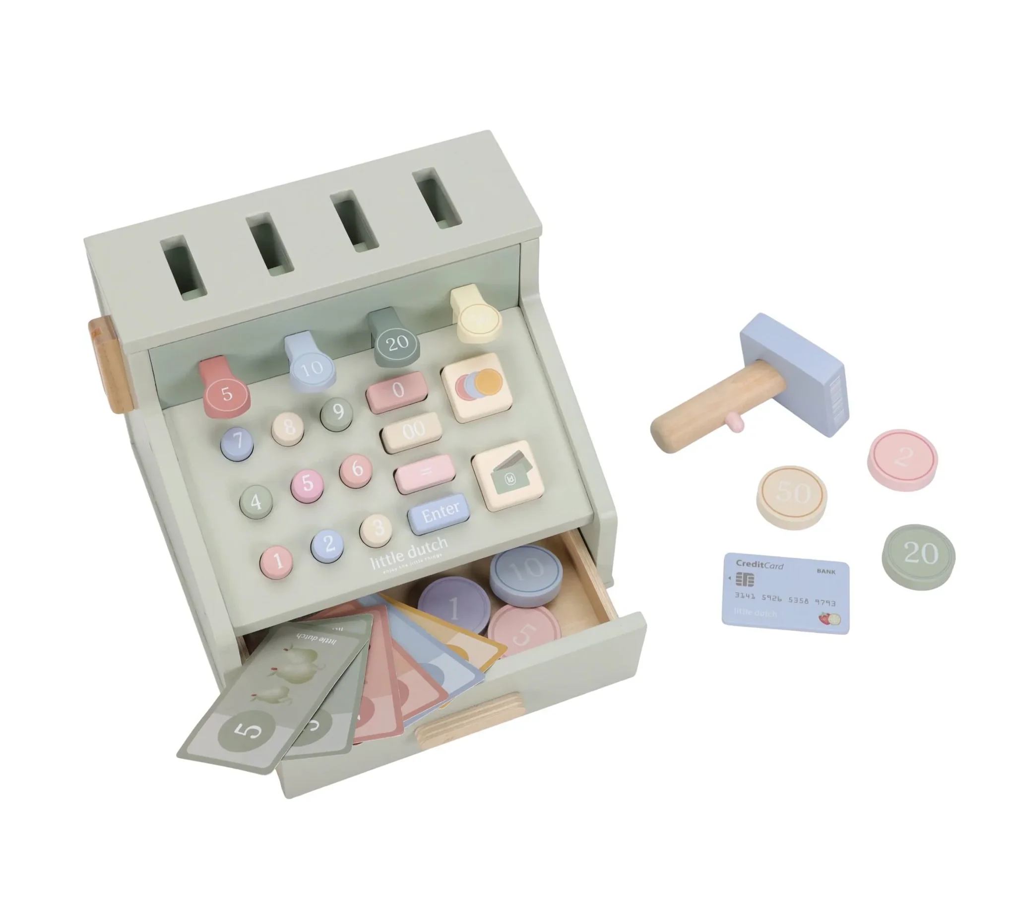 Calculez, scannez et payez ! Avec cette caisse enregistreuse en bois, jouer au magasin semble encore plus réel. La caisse enregistreuse est équipée d’un scanner, d’un lecteur de carte de débit, de boutons et d’un tiroir-caisse pour les pièces et les billets. Une carte de débit est également incluse, afin que les clients puissent payer en espèces et par carte. Une façon fantastique de jouer avec de l’argent et des chiffres. Qu’est-ce que ça peut être aujourd’hui ?