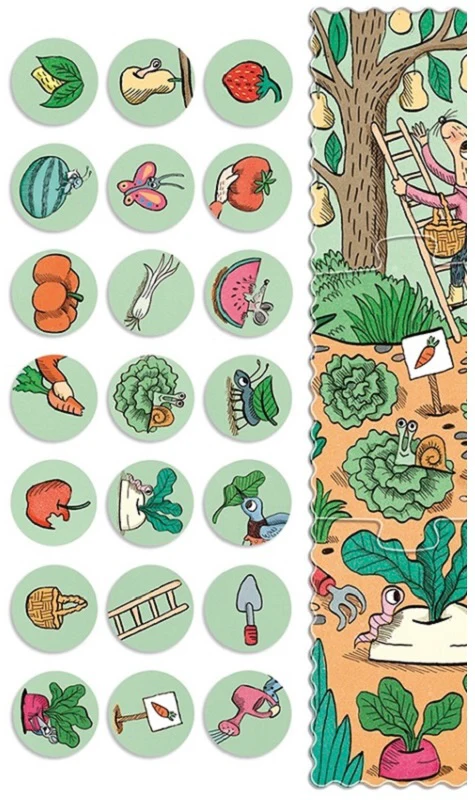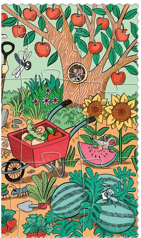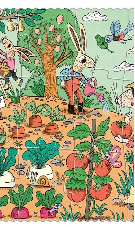 Nos amis les lapins font pousser des fraises, des laitues, des pastèques et bien d’autres fruits et légumes dans leur jardin. Un puzzle de 24 pièces qui se complète par un jeu d’observation. Une fois le puzzle résolu, nous disposons de 24 objets que nous retrouverons dans l’image, stimulant ainsi la découverte du monde du jardin, des fruits et des légumes.