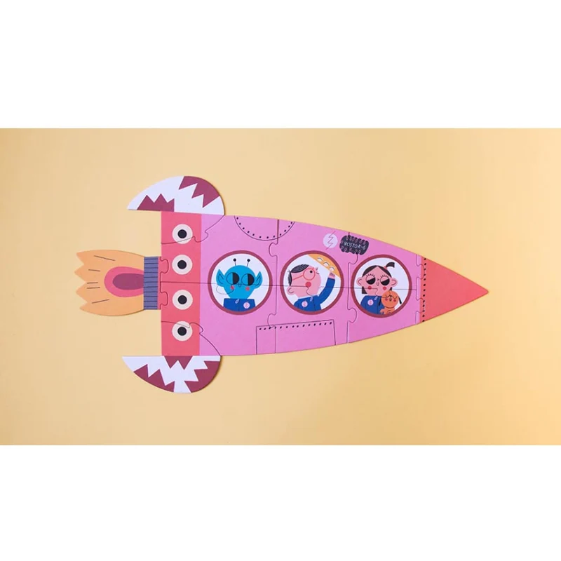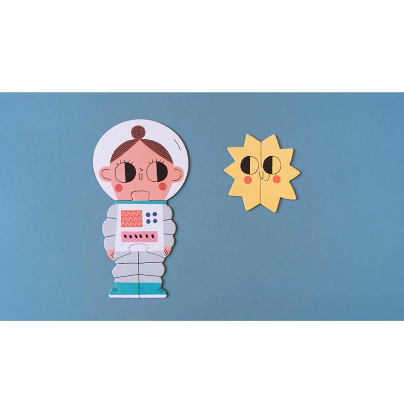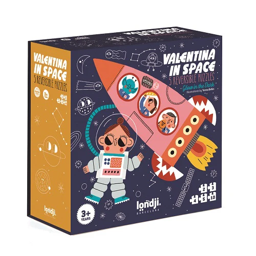 Voyagez avec Valentina et ses amis dans l’espace et découvrez quelques-unes des merveilles de notre système solaire : la Terre, la Lune et les étoiles ! Comprend 5 puzzles réversibles de 2, 3, 4, 5 et 10 pièces avec une surprise: une fois assemblés, ils brillent dans le noir!