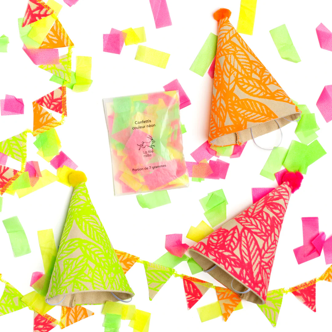 Célébrez un anniversaire haut en couleur grâce à ce chapeau de fête de tissu orné d’une sérigraphie rose fluo. Une belle façon d’instaurer un rituel de fête de façon écologique. Un plaisir renouvelé à chaque année! Une fête sur le thème flashy, Youppi!