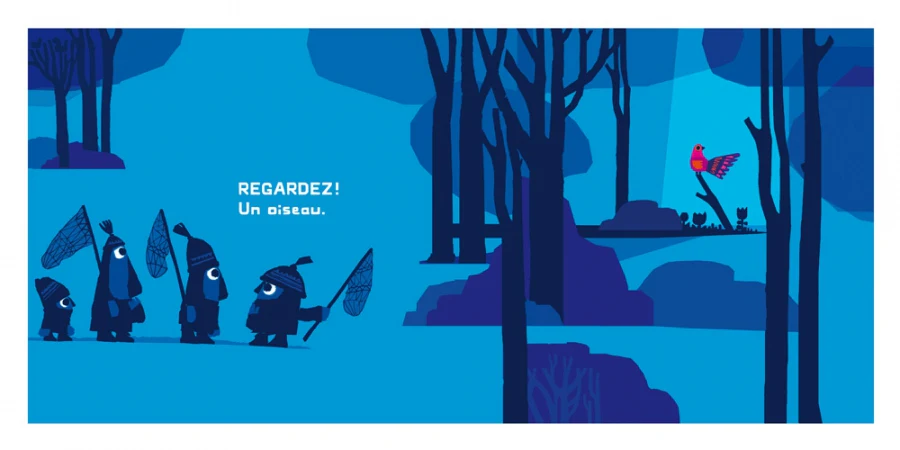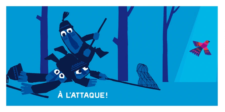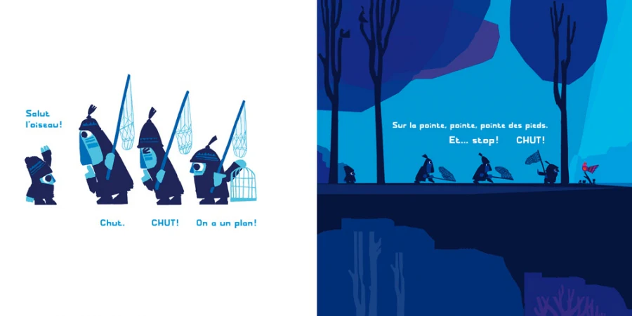 Dans une forêt sombre, quatre chasseurs armés de filets de papillon à la poursuite d’un bel oiseau… Le plus petit voudrait bien devenir son ami, mais chut !… les autres, pour l’attraper, ont un plan…