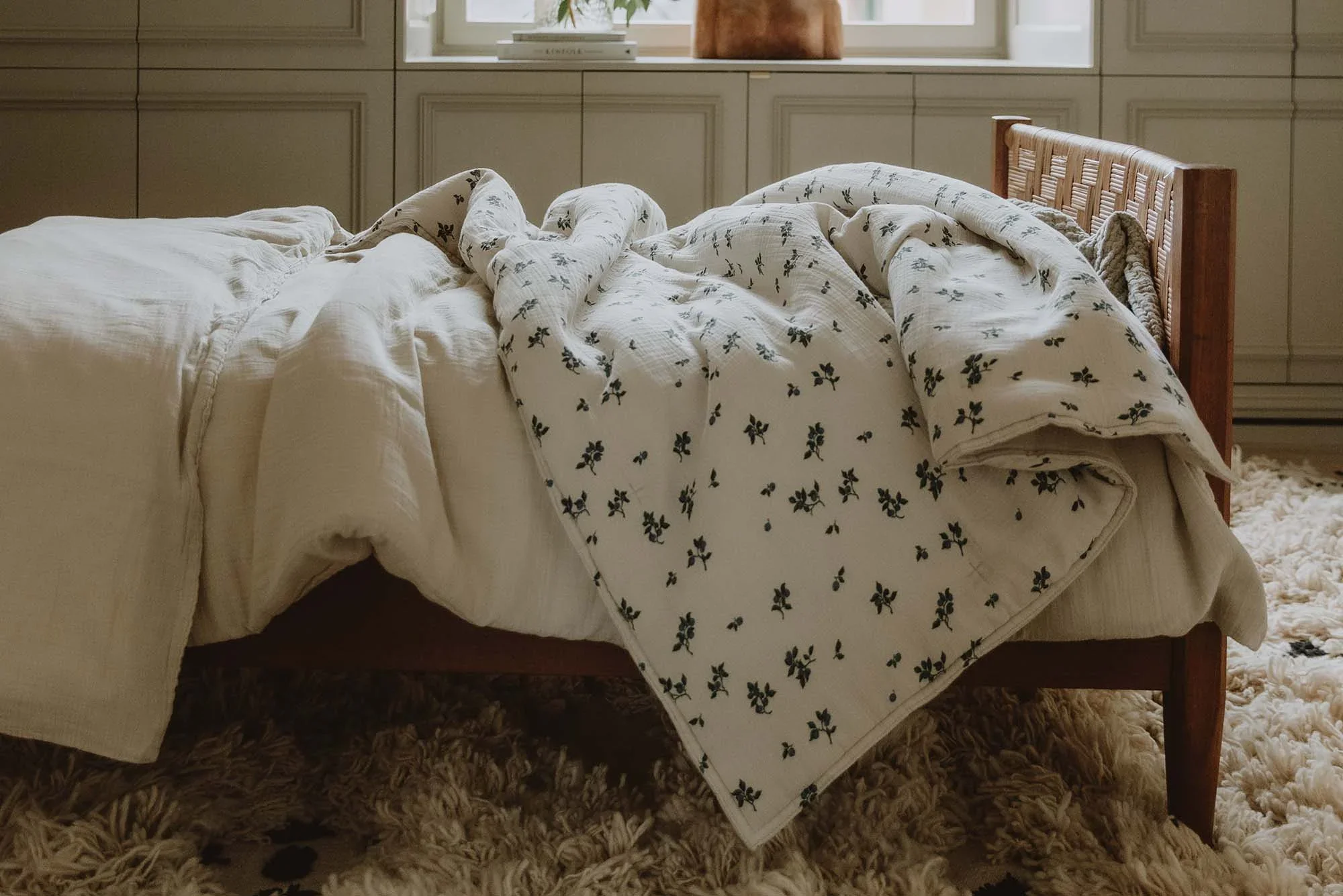 Cette couette rembourrée toute douillette est fait de mousseline de coton douce et aérienne de la plus grande qualité: on croirait être enveloppé d’un nuage! Taille parfaite pour un lit de bébé ou un merveilleux matelas d’éveil.