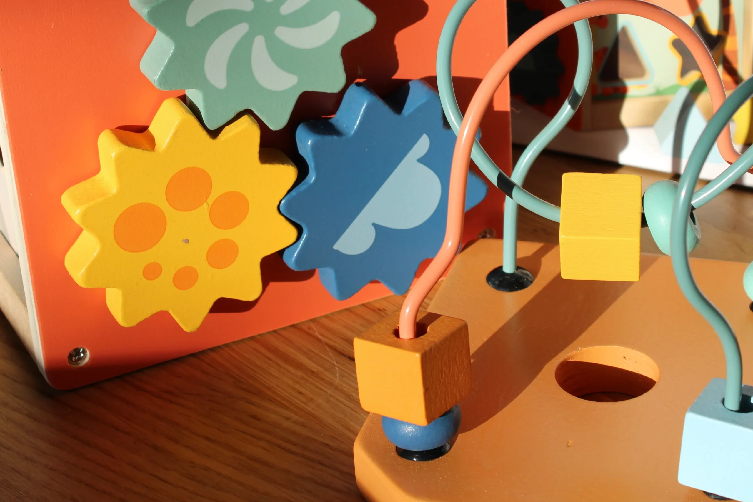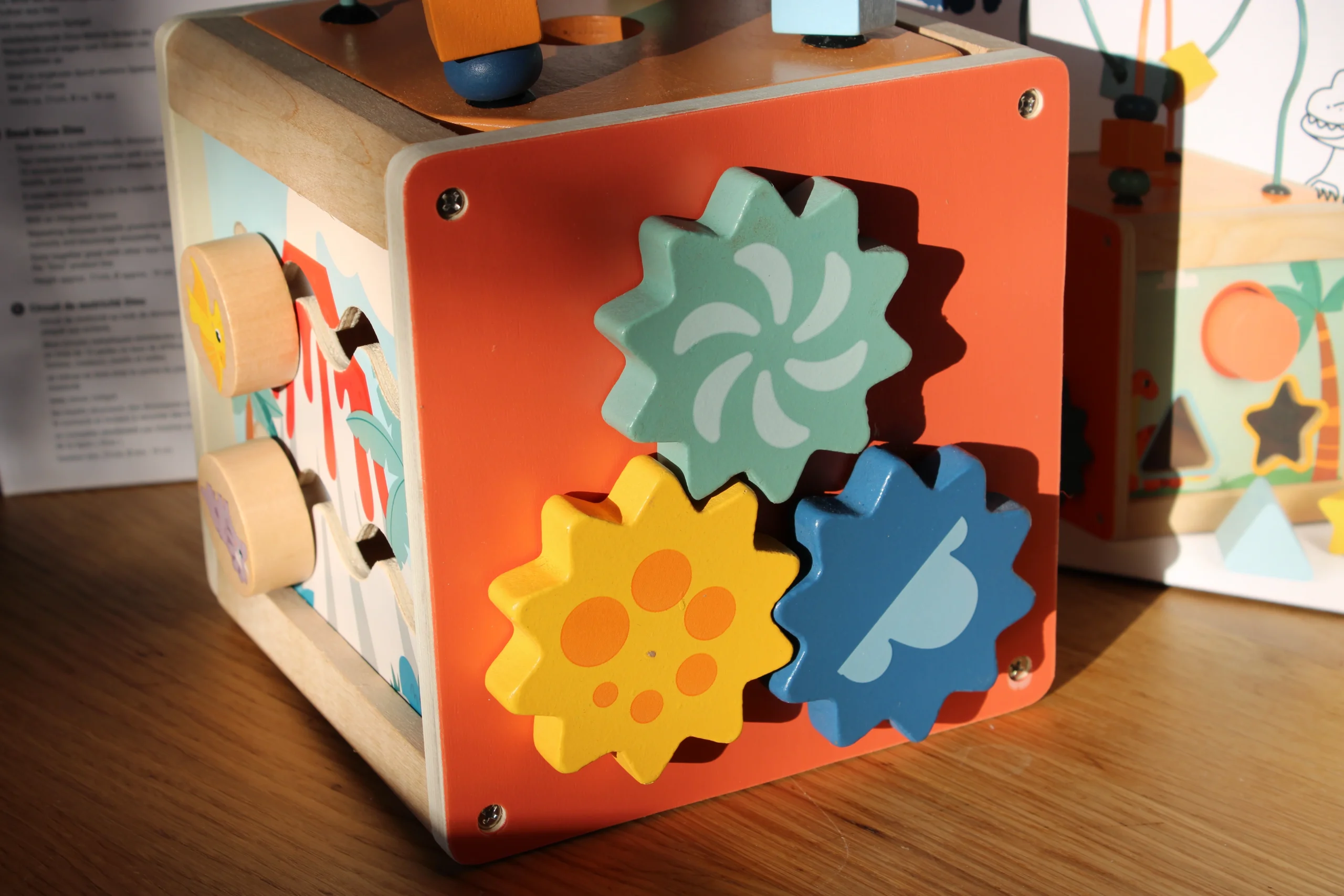Ce cube de motricité multifonctions offre cinq surfaces ludiques pour stimuler les capacités motrices et l’imagination des petits. Il comprend deux boucles de motricité, un jeu d’encastrement de formes, un labyrinthe coulissant, des volets tournants et des roues dentées, offrant une variété d’activités pour divertir et développer la coordination des tout-petits.