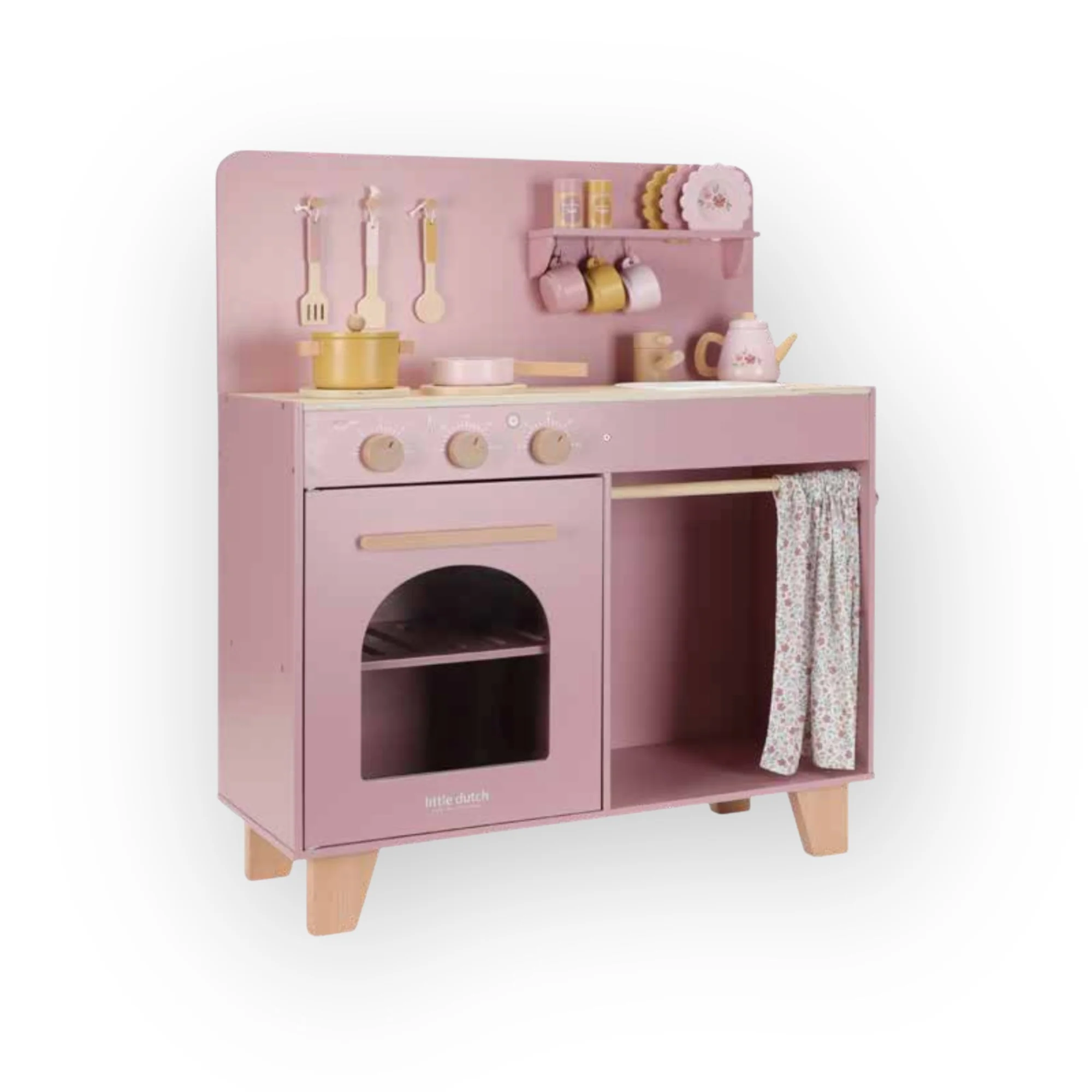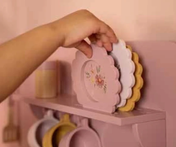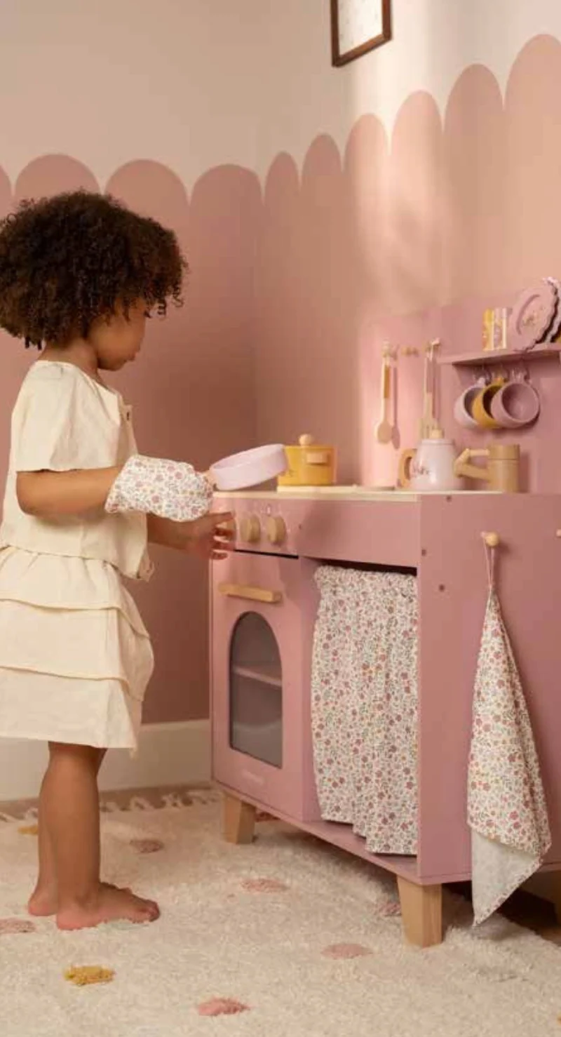L’ensemble comprend deux poêles, des ustensiles de cuisine, trois tasses et trois assiettes, tous ornés d’illustrations mignonnes. Un gâteau peut être cuit dans le four, des légumes mijotés sur la cuisinière qui émet un bruit de bulles réaliste lorsqu’une casserole y est posée. L’évier permet de se laver les mains, et les provisions trouvent leur place dans le placard. Le four à micro-ondes est doté de véritables boutons illustrés pour un jeu encore plus immersif. Le set de sel et de poivre permet d’ajouter la touche finale à chaque plat. Le rideau en tissu du garde-manger, le torchon et le gant de cuisine sont décorés de l’imprimé Soft Flowers, ajoutant une touche florale pleine de douceur. Une charmante cuisine qui promet des heures de jeu, de créativité et de plaisir culinaire !