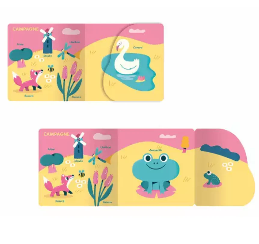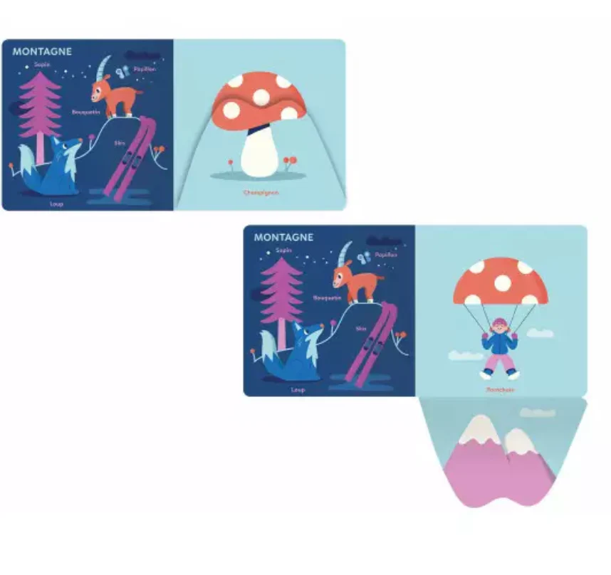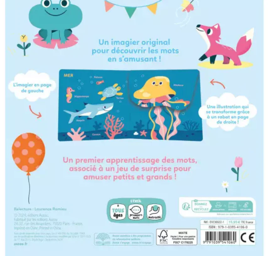 Un premier imagier à flaps pour apprendre en s’amusant : un imagier thématique en page de gauche et, en page de droite, une illustration d’un mot de cette thématique qui se transforme en une autre illustration (accompagné d’un autre mot, de la même thématique) grâce à des rabats. Un premier apprentissage des mots et du vocabulaire associé à un jeu de surprise pour amuser petits et grands !
