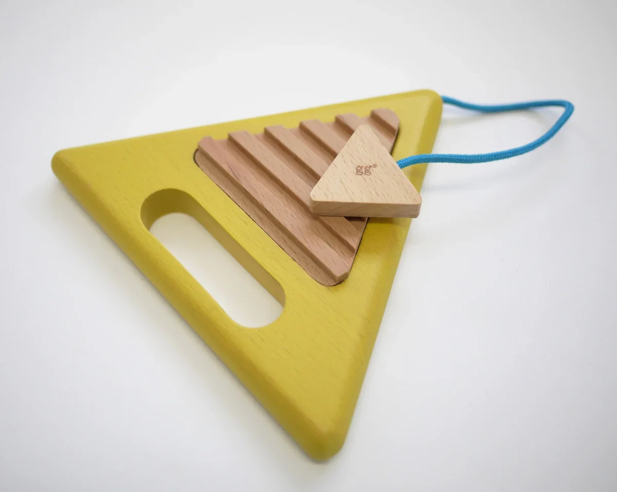 Pour découvrir les sons et jouer avec, les instruments Gakki sont tout indiqués. Trois instruments différents, des sons uniques à chacun, mais aussi des formes et des couleurs à apprendre, soit : un tambour tout rond, un triangle à gratter et un carré à grelots.