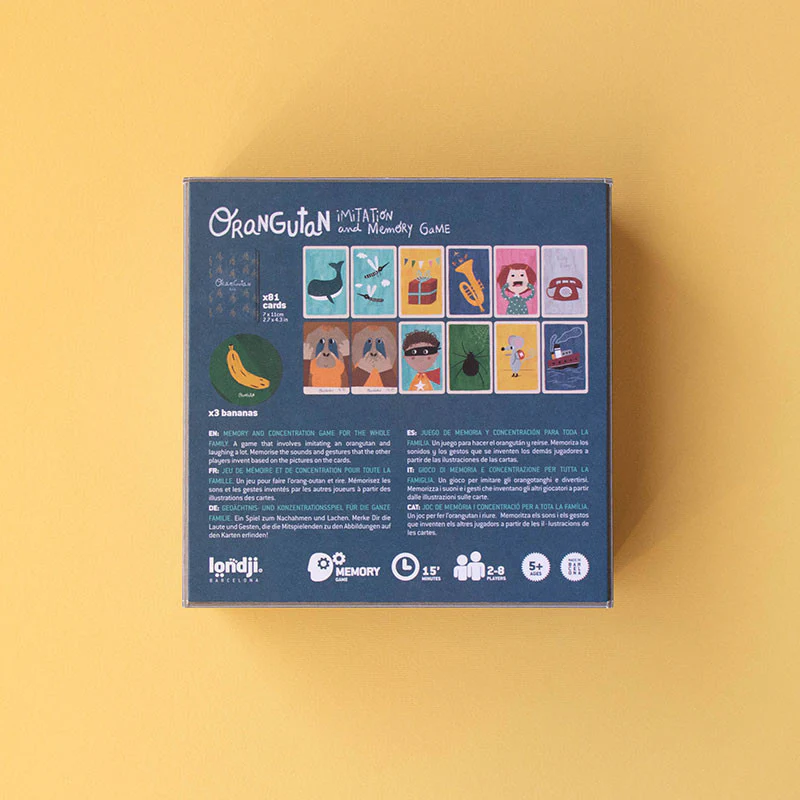 Un jeu où vous devez vous souvenir de la séquence de sons et de gestes créés par tous les joueurs à partir des images des cartes à jouer. Il faut obtenir 3 cartes orang-outan avant qu’il n’y ait plus de bananes !