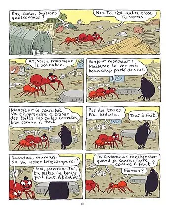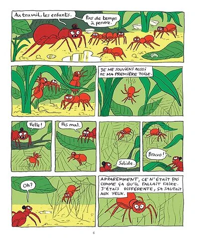 Pas facile d’être une petite araignée quand on n’a pas de talent pour le tissage. Pour lui apprendre à faire de belles toiles, sa maman la laisse entre les pattes du terrible Monsieur le scarabée et de sa petite clique de pattes cassées. Elle y fait la connaissance d’une mouche qui « fofote » à cause de ses dents, d’un bourdon qui n’arrête pas de pleurer et d’une luciole qui n’éclaire qu’à moitié. Ensemble, ils décident de s’enfuir à la tombée de la nuit, à la recherche d’un ailleurs beaucoup plus beau. L’aventure les amènera plus loin que prévu, jusqu’au bout du fil…