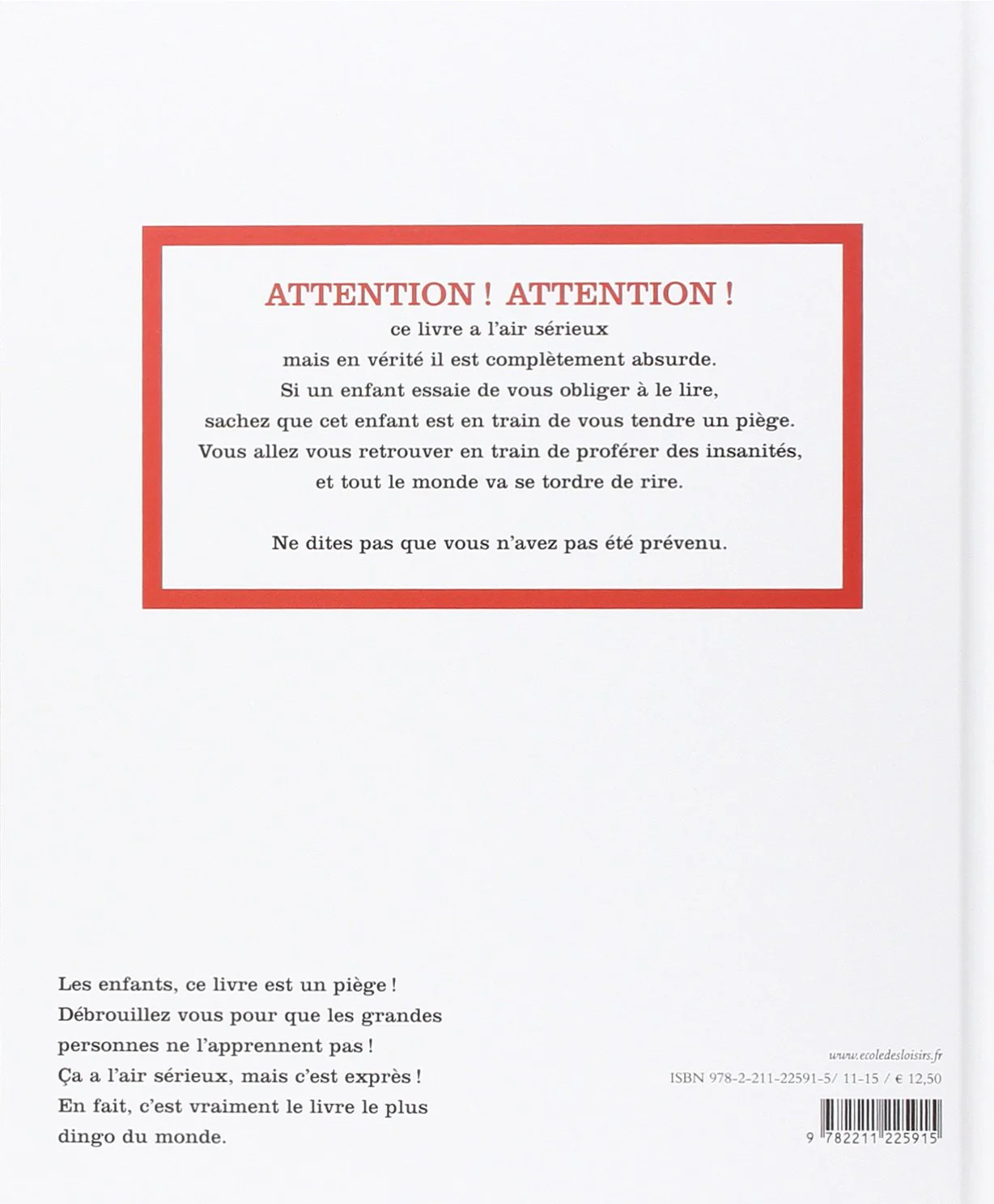 Ce livre a l’air sérieux mais en vérité il est complètement idiot. Si un enfant essaie de vous obliger à le lire, sachez que cet enfant est en train de vous tendre un piège. Vous allez vous retrouver en train de proférer des insanités, et tout le monde va se tordre de rire. Ne dites pas que vous n’avez pas été prévenu.