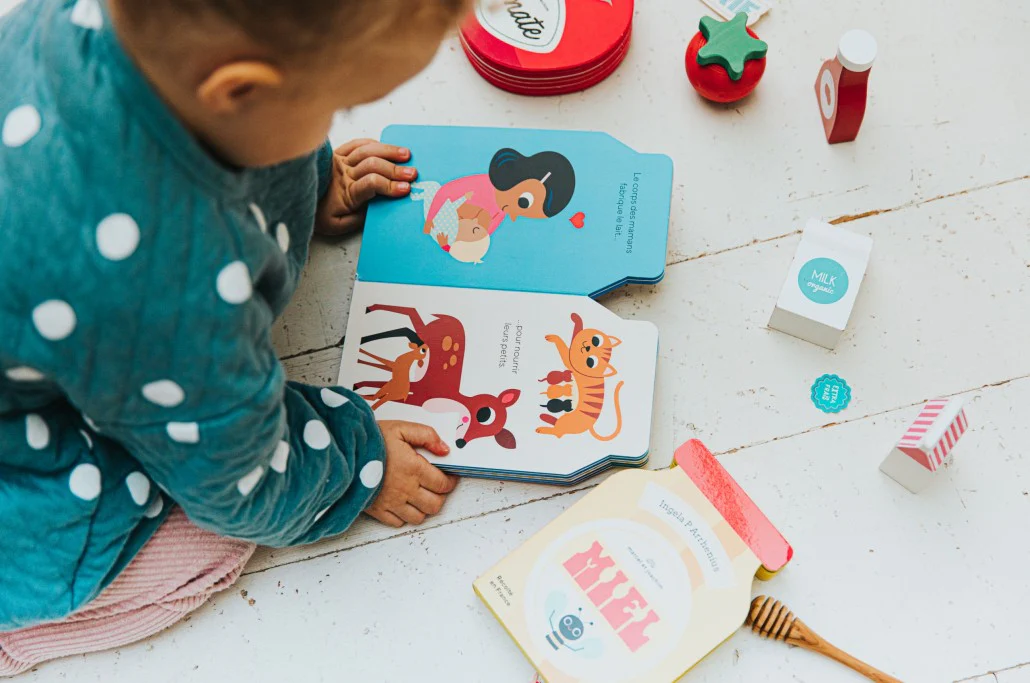 Collection Ma petite épicerie : Des livres pour jouer, apprendre et éveiller bébé à ce qu’il mange. Des notions documentaires précises adaptées au tout-petit dès 1 an, sans jamais oublier l’évocation du goût, des textures, des odeurs et des couleurs pour que le plaisir de manger et la beauté soient au coeur de l’apprentissage. Des livres-objets irrésistibles, qui garantissent de longues heures de lecture-jeu. Un format léger, robuste et facile à manipuler avec d’épaisses pages en mousse.