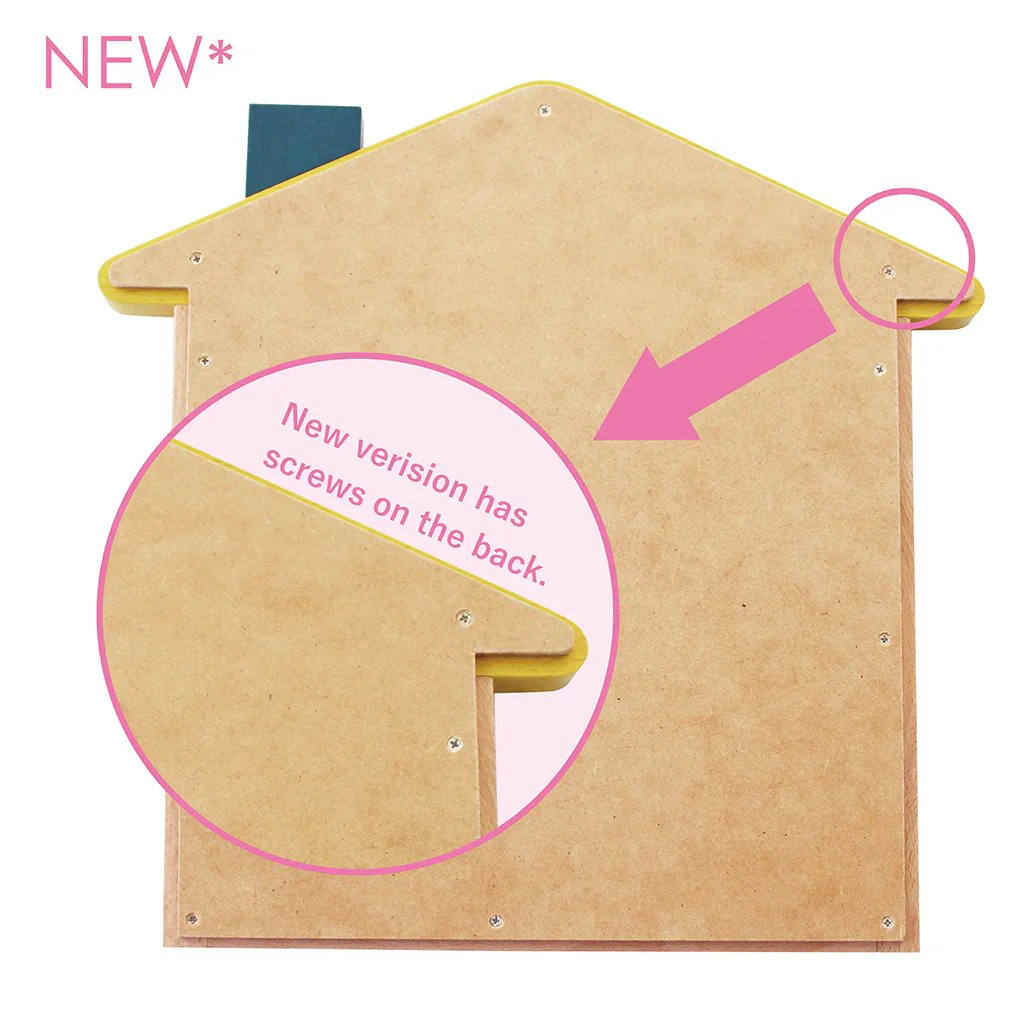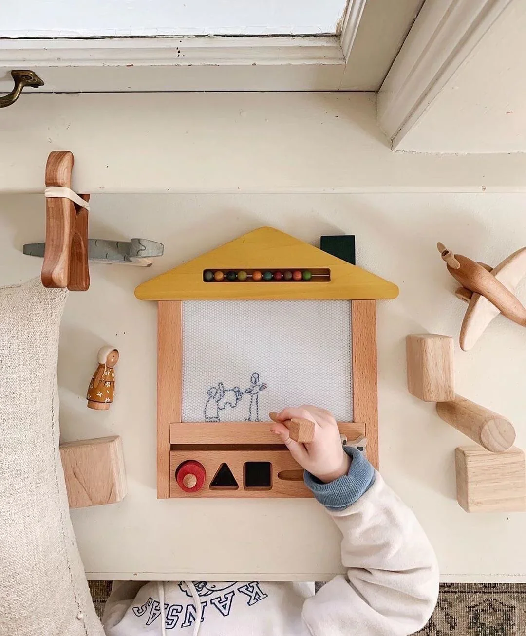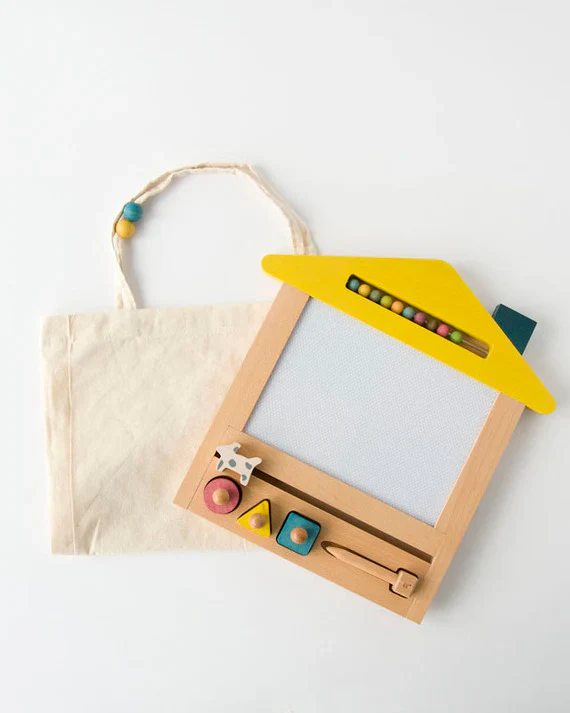 Une petite maisonnette en bois aimantée sur laquelle on peut dessiner en quatre couleurs avec un crayon magnétique ou des formes à étamper! Pas satisfait du résultat? On efface, et hop, on recommence!