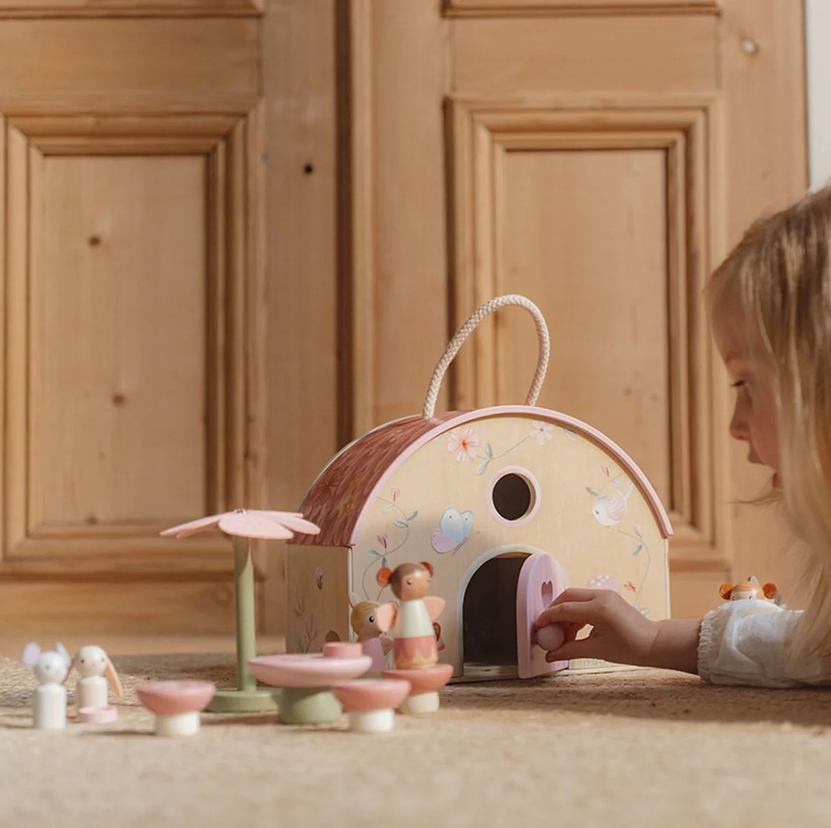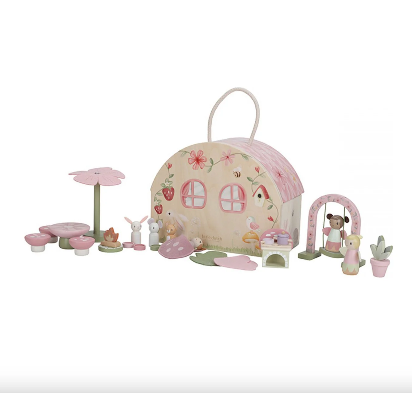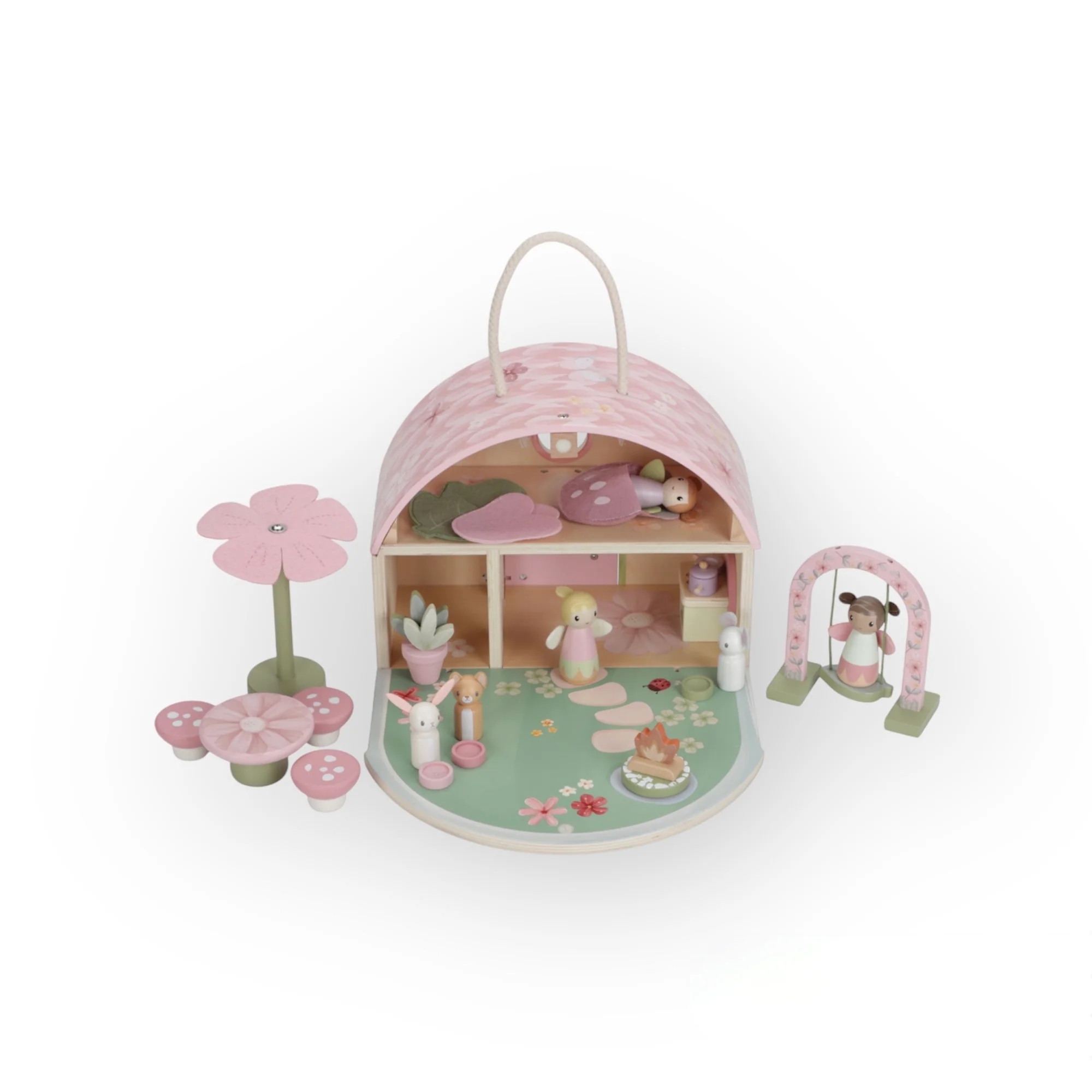 Bienvenue dans la maison de poupée Very Fairy Dollhouse ! Dans le Jardin des Fées, là où fleurissent les plus belles fleurs, les fées dansent. Cette charmante maison de poupée, dans laquelle vit la fée, est un refuge magique pour des aventures enchantées. Elle est décorée de branches de fleurs et d’adorables petites créatures des bois. Sa porte est toujours ouverte, avec des chaises, une table ronde et un parasol pour que la fée et ses amis puissent pique-niquer et rire ensemble. Lorsque lla nuit tombe, il suffit de replier la maison et de la ranger soigneusement. Ce chalet douillet, digne d’un conte de fées, est parfait pour des heures de jeux imaginatifs et de rêves enchantés.