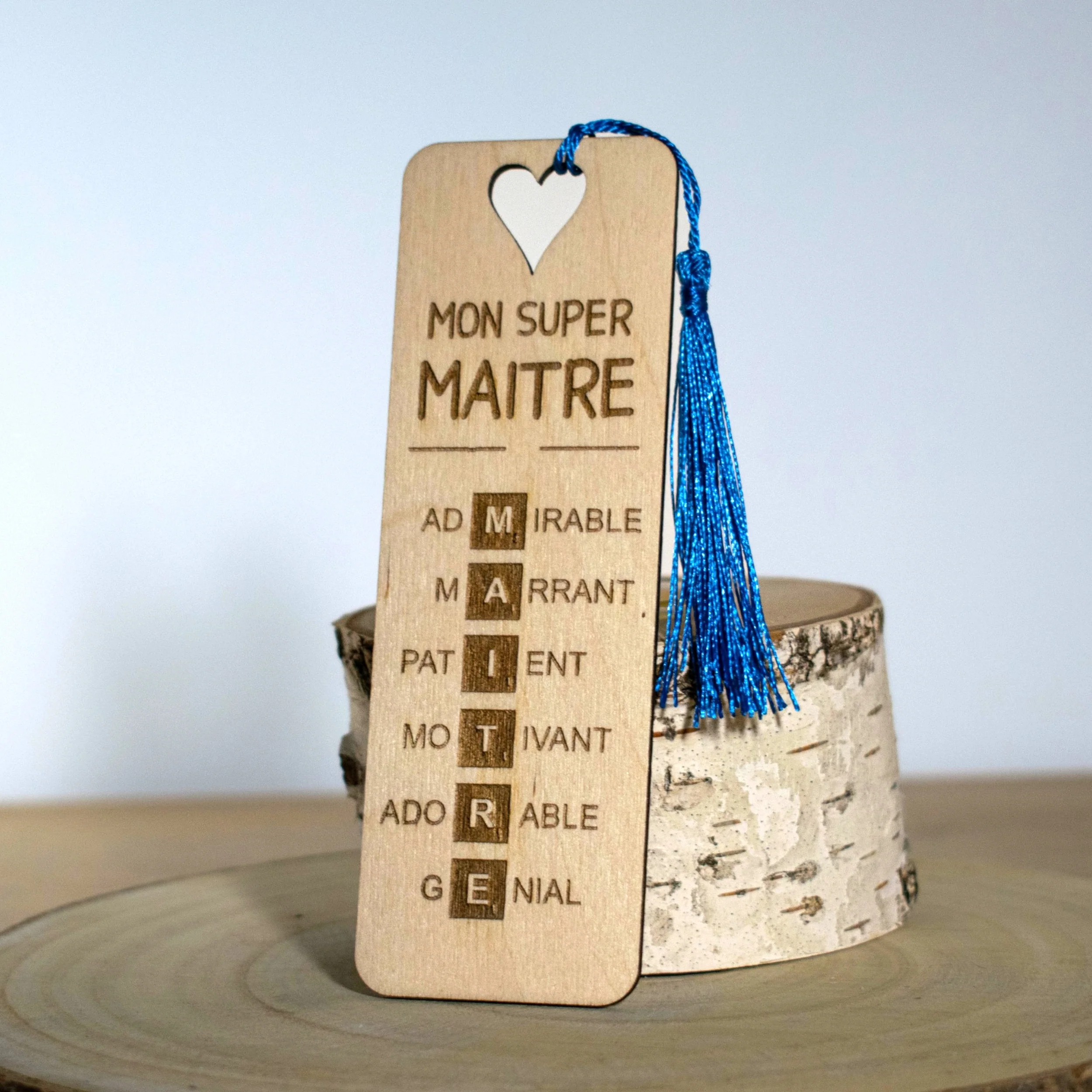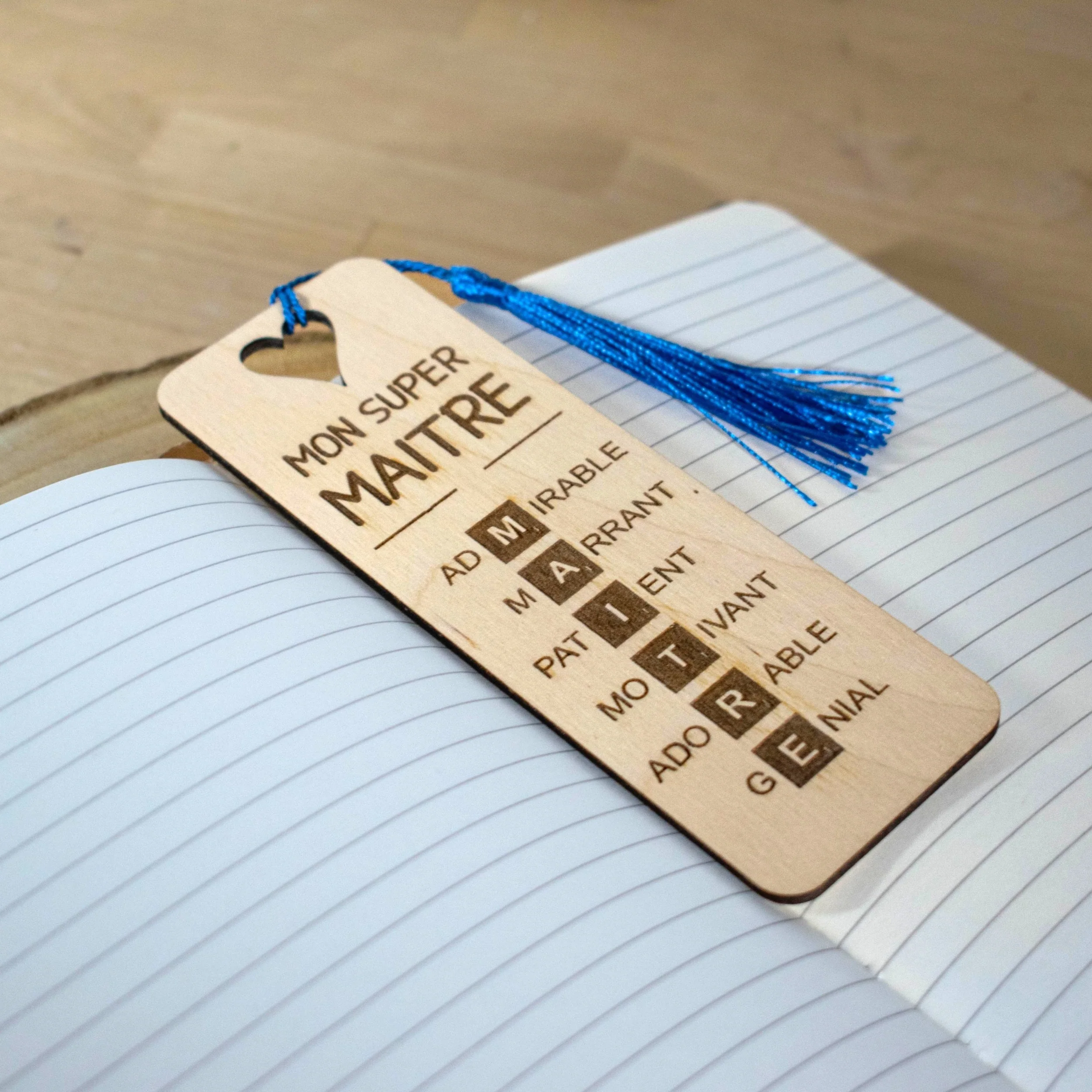 Marque-pages en bois avec pompon – bleu – maitre – scrabble