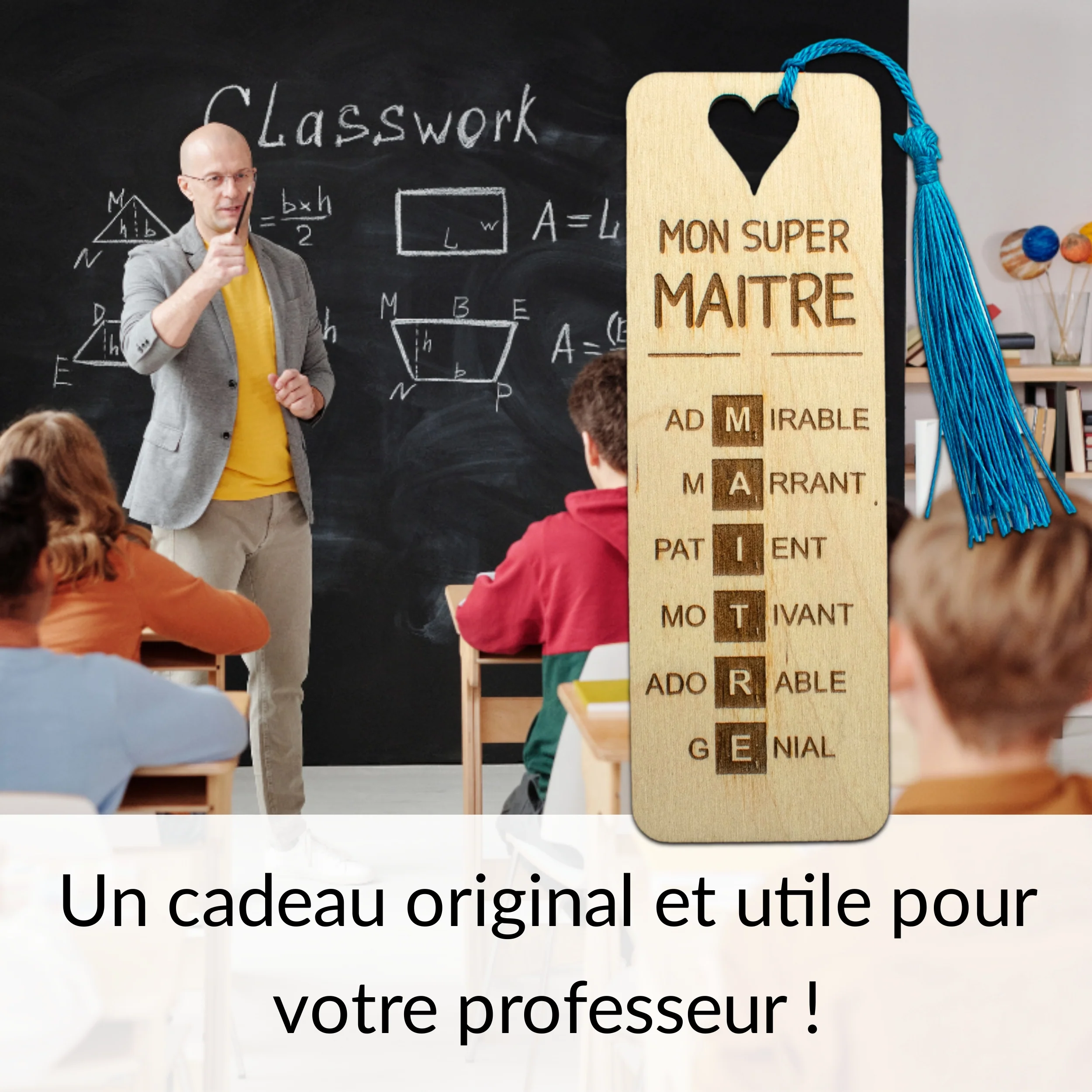MARQUE-PAGES EN BOIS AVEC POMPON – BLEU – MAITRE – SCRABBLE