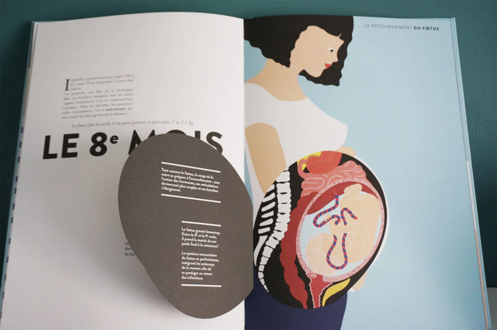 Pour tout savoir de la grossesse, depuis la conception jusqu’aux premiers temps du bébé. Des doubles-pages animées par des découpes et des flaps expliquent le système reproducteur de l’homme et de la femme, la fécondation, la division cellulaire, la PMA, le patrimoine génétique, l’échographie, les jumeaux, la prématurité, et mois après mois le lecteur peut suivre l’évolution de l’embryon. Hélène Druvert donne corps à cette merveilleuse mécanique interne jusqu’à l’accouchement, avant de refermer le livre en beauté sur les premiers moments de la vie : l’allaitement, le développement moteur et l’évolution des sens du bébé.