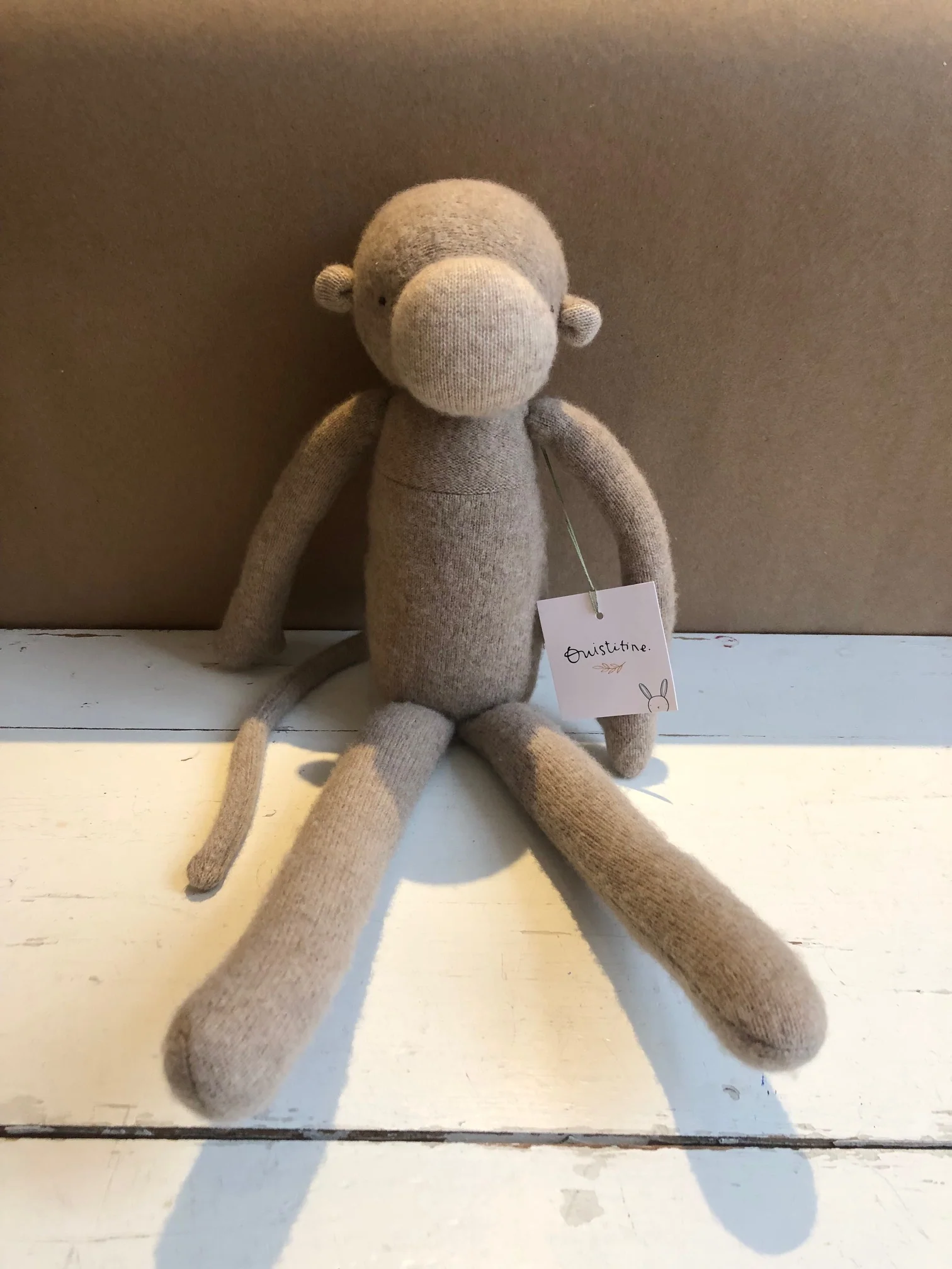 Le ouistiti est un parfait compagnon pour le jeu ou la sieste. Ce joyeux singe est fait à la main à partir de chandails en pure laine récupérés et bourré de laine cardée naturelle. Il ne vous quittera plus et vous suivra pour les générations futures.