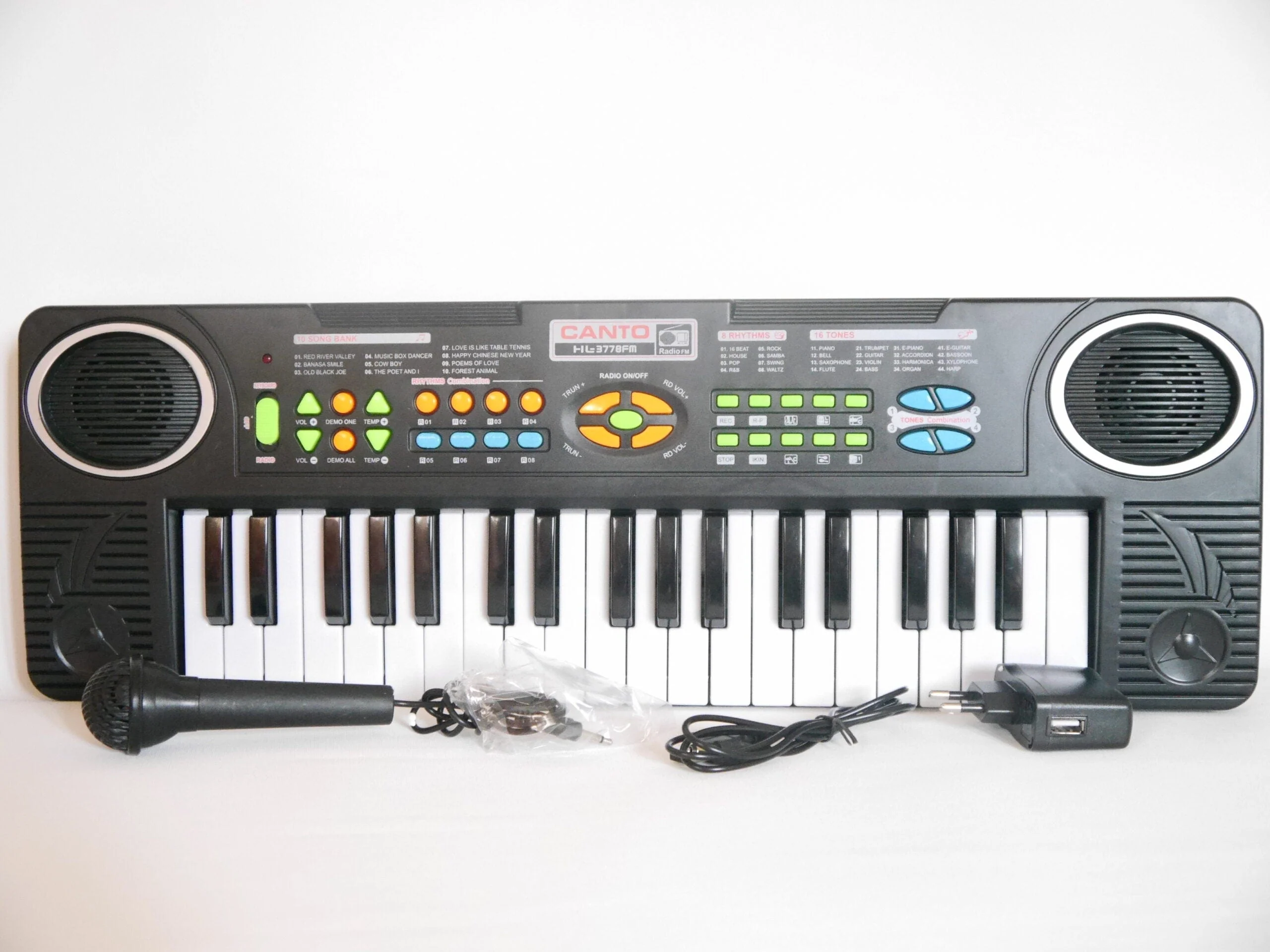 37 touches Piano10 sonorités enregistrées16 Tonalités8 RythmesEnregistrement/LectureContrôle Du VolumeContrôle du TempoMicrophoneControle volumeRadio FMAlimentation à pilesHaut parleur.