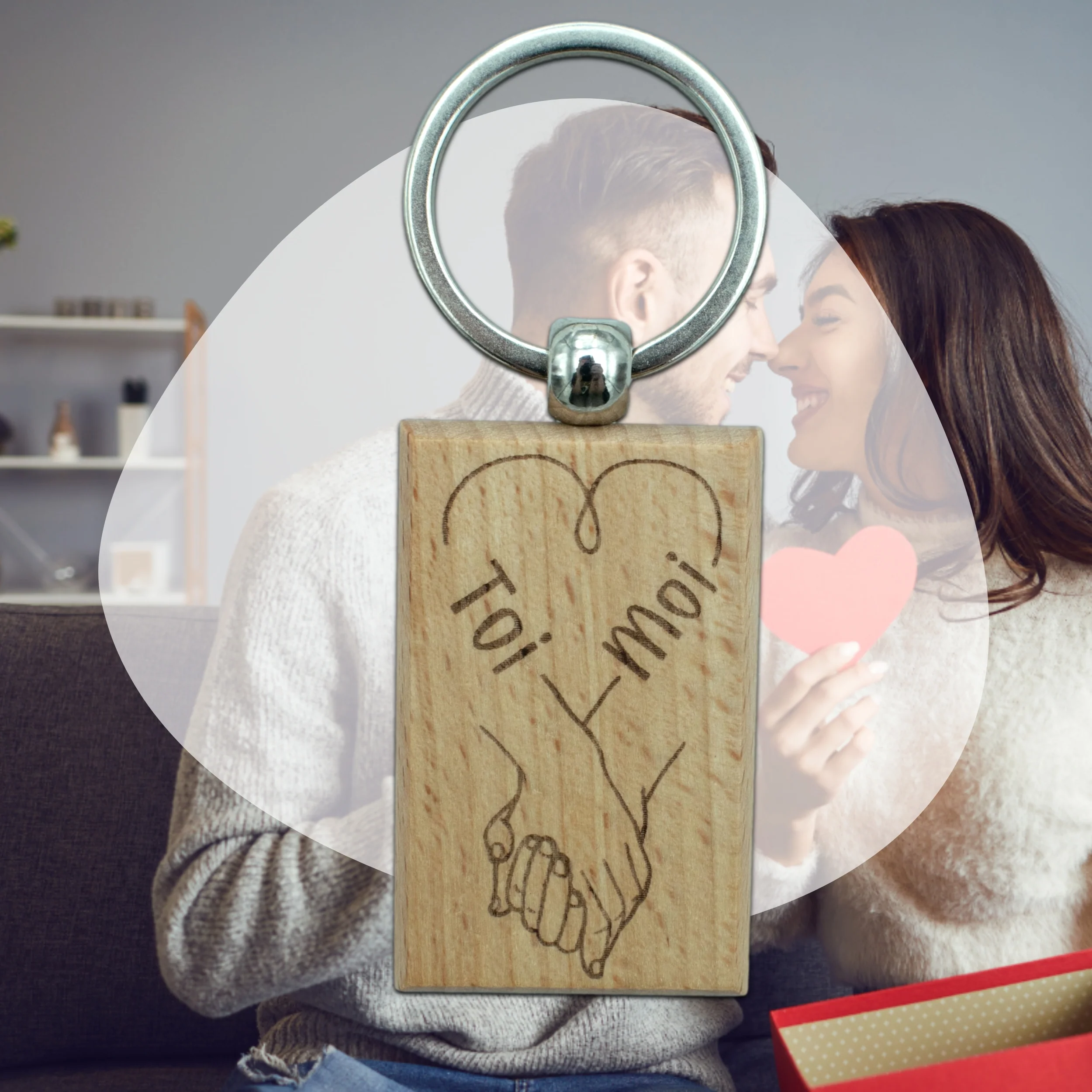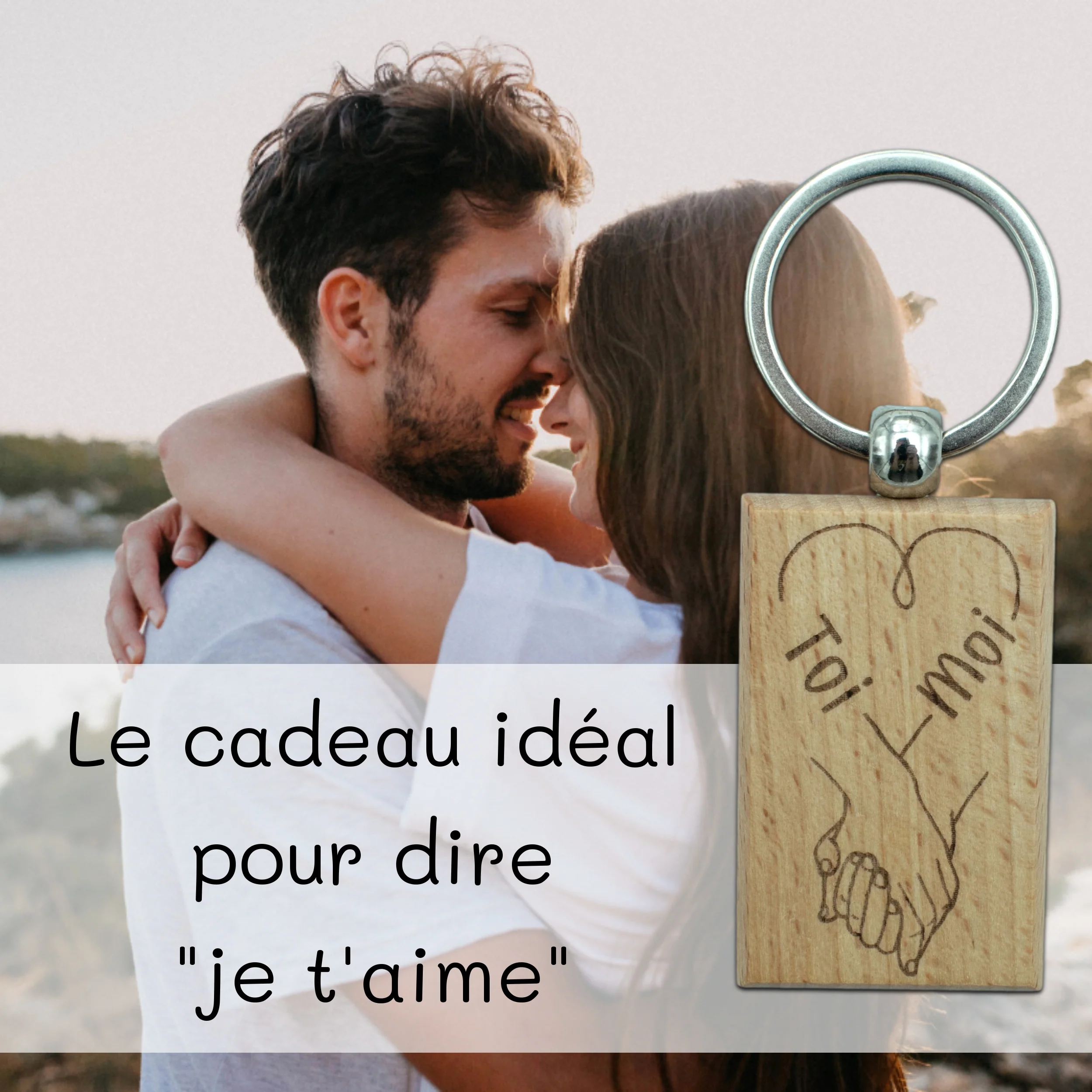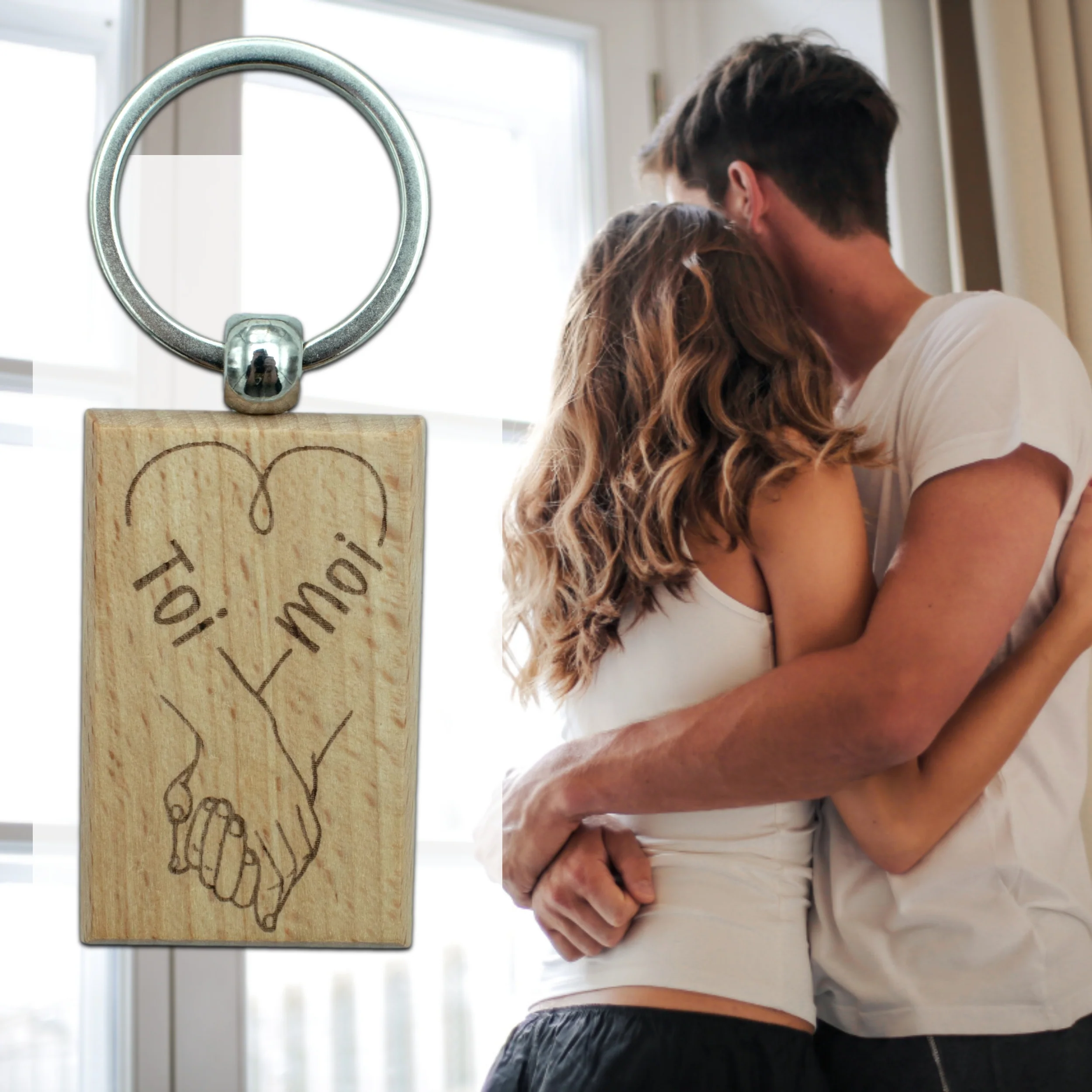 Porte-clefs rectangle en bois – amour – mains liées