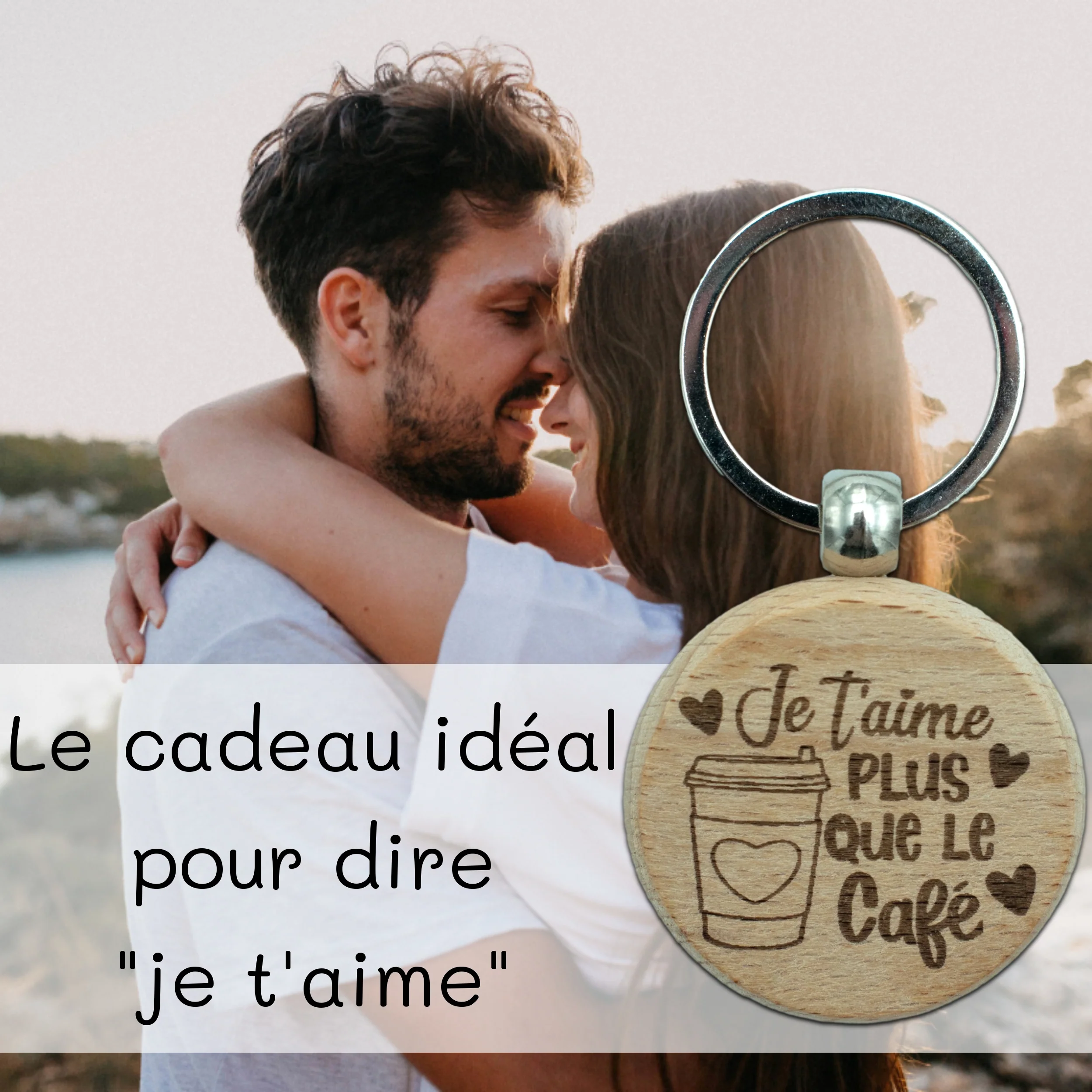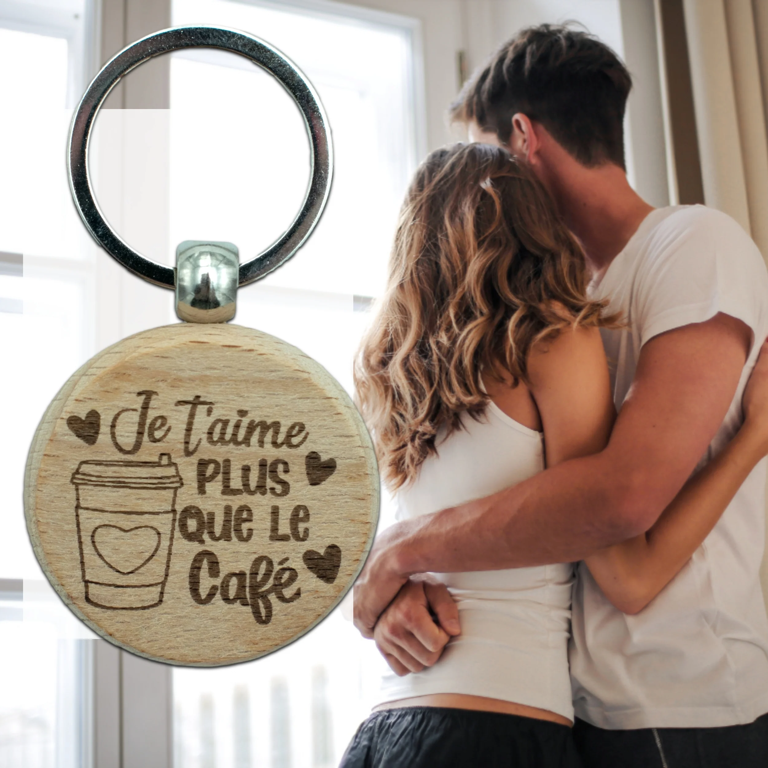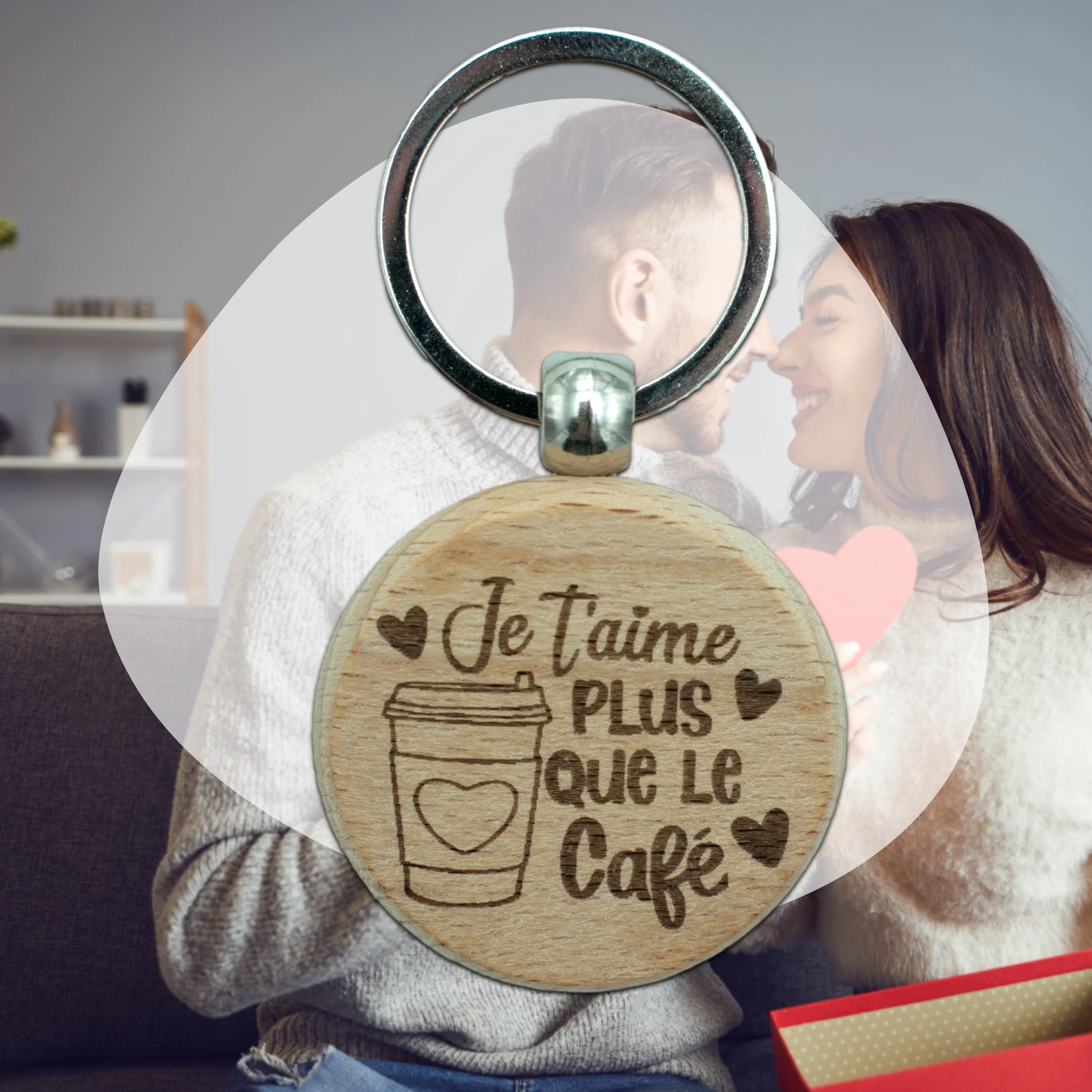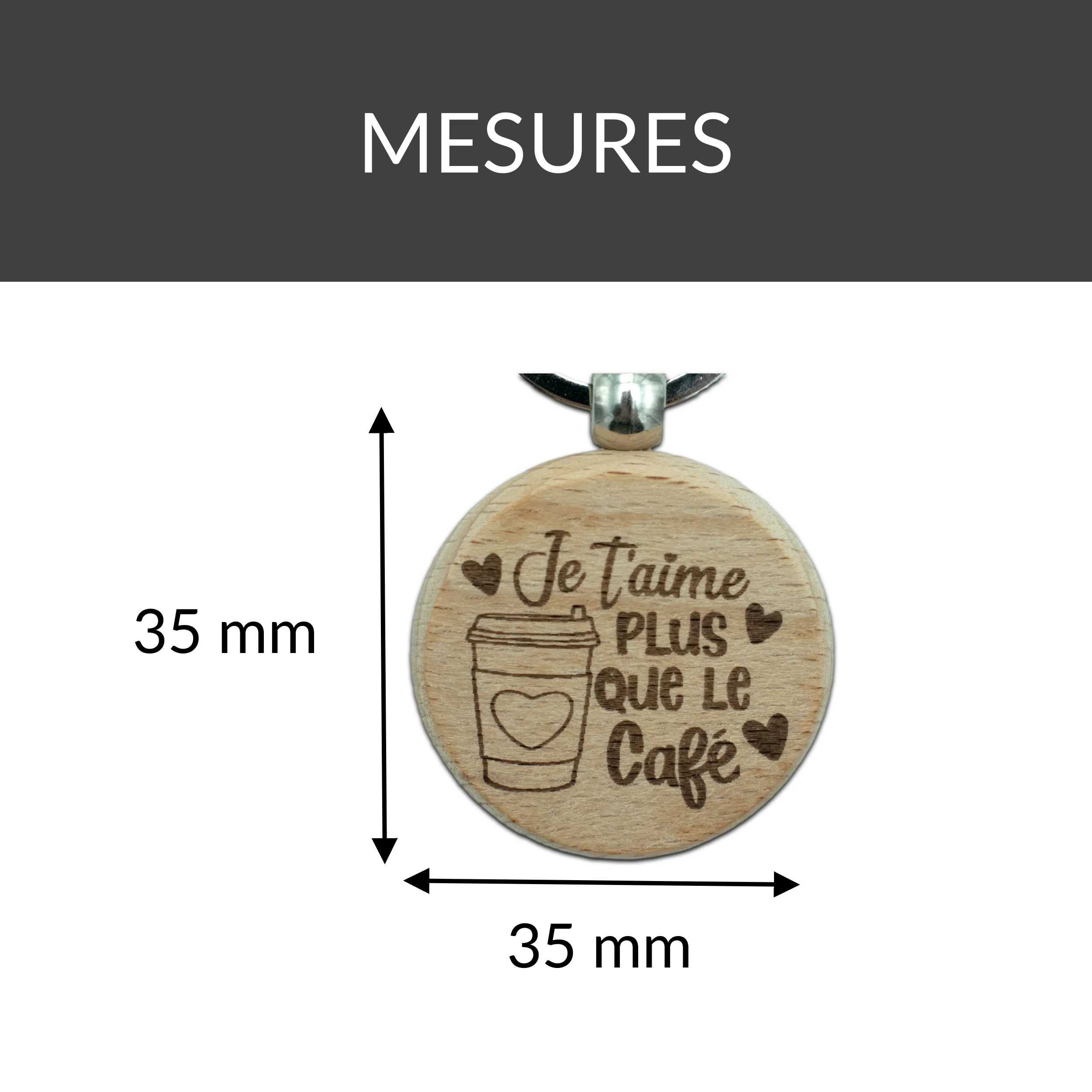 PORTE-CLEFS ROND EN BOIS – AMOUR – JE T’AIME PLUS QUE LE CAFÉ