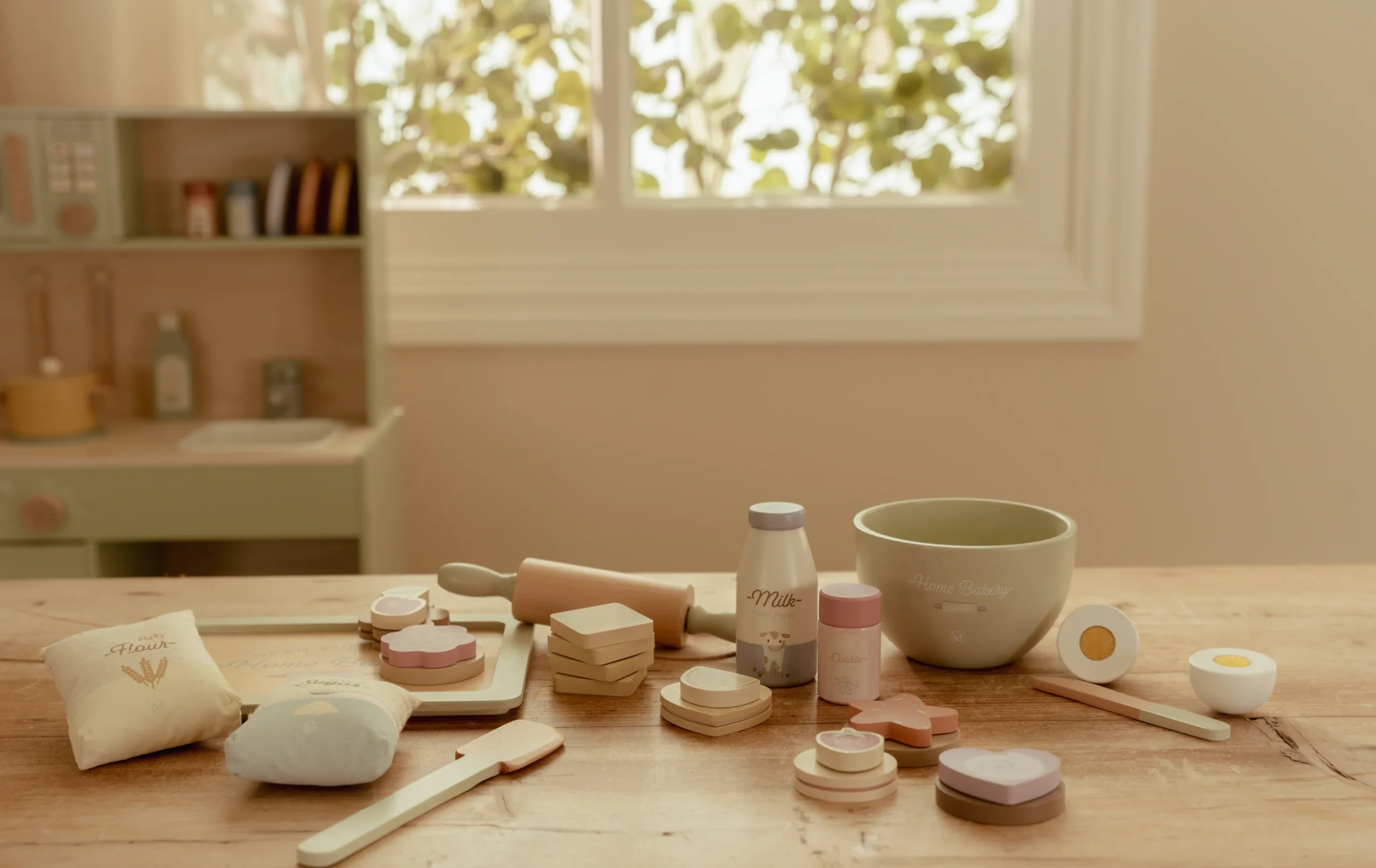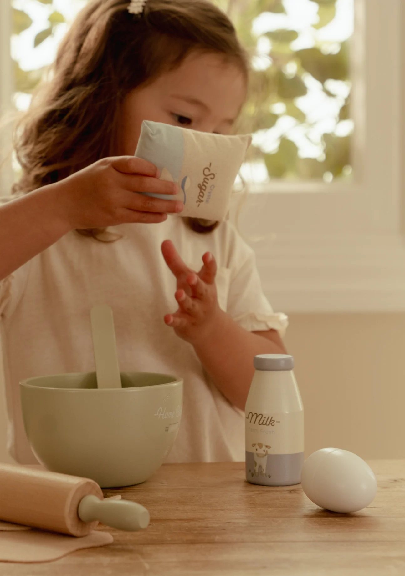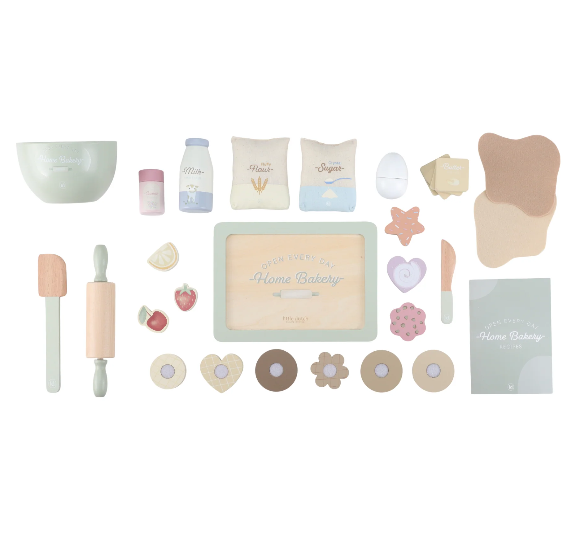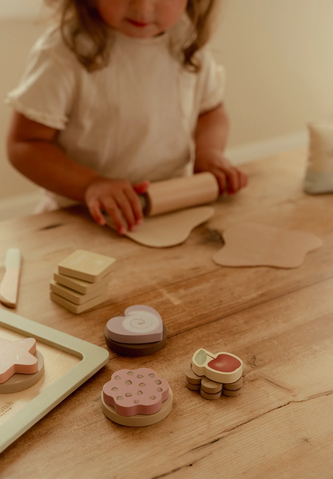 Il est temps de cuisiner quelque chose de délicieux ! Avec cet ensemble de pâtisserie en bois, les petits boulangers apprennent tout sur la préparation de délicieux biscuits et gâteaux. Le set comprend une carte de recettes et tous les accessoires nécessaires, tels qu’un bol de mélange, une plaque à biscuits, des garnitures, un œuf, du beurre, de la farine, du sucre, du lait et même des vermicelles colorés. Étalez la pâte en feutre avec le rouleau à pâtisserie et décorez les biscuits à votre guise. Le set parfait pour des heures de jeu sans fin dans la cuisine de jeu !