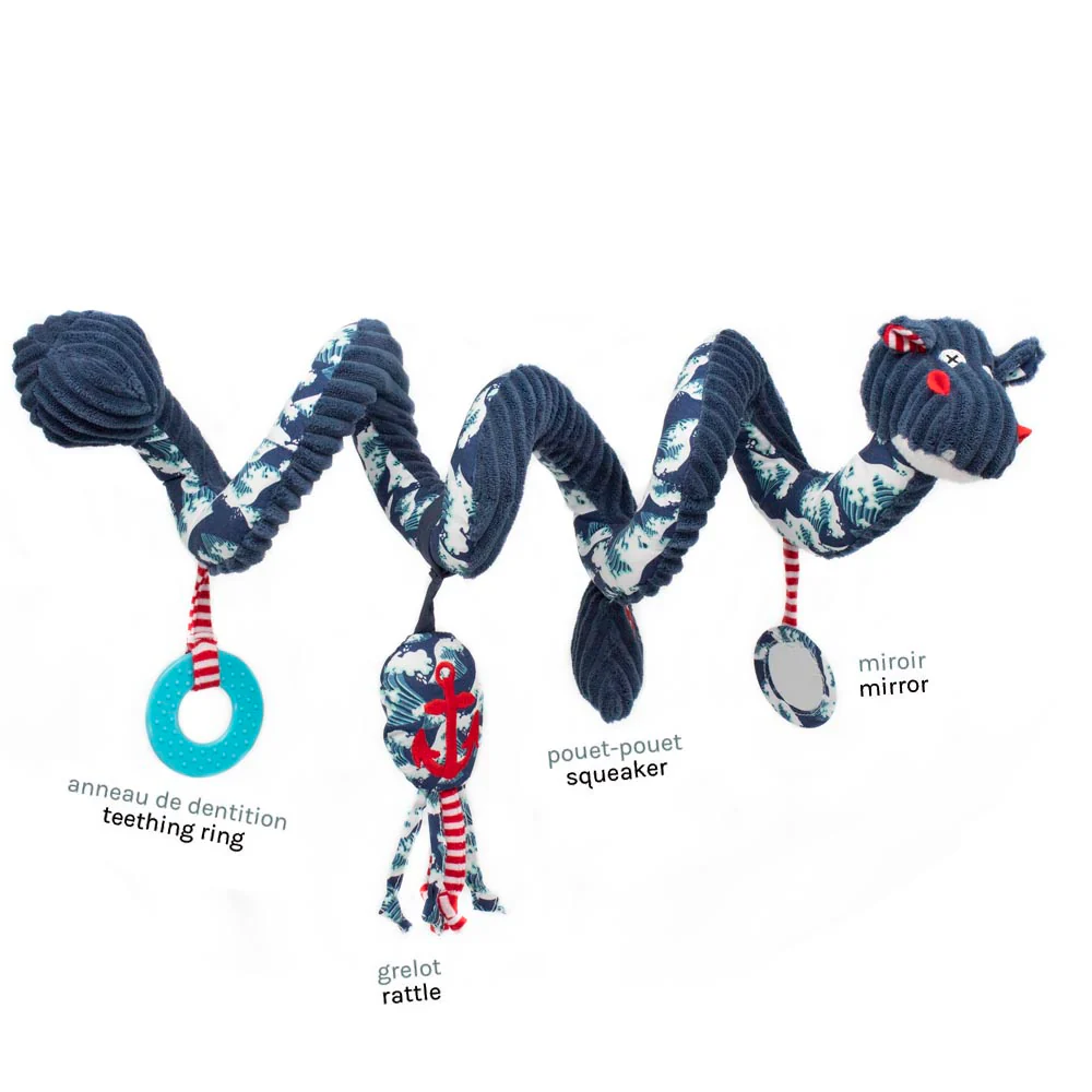 A l’effigie d’Hippipos l’hippopotame, cette spirale d’activités bleue et colorée est un jouet d’éveil ludique et original ! Elle peut s’accrocher partout : au transat, au lit, à la poussette ou encore au parc… jusqu’à 40 cm de longueur déployée. Bébé s’amusera tout en s’éveillant grâce à ses nombreuses activités : un pouet-pouet, un petit miroir, des nœuds, un grelot et un anneau de dentition.