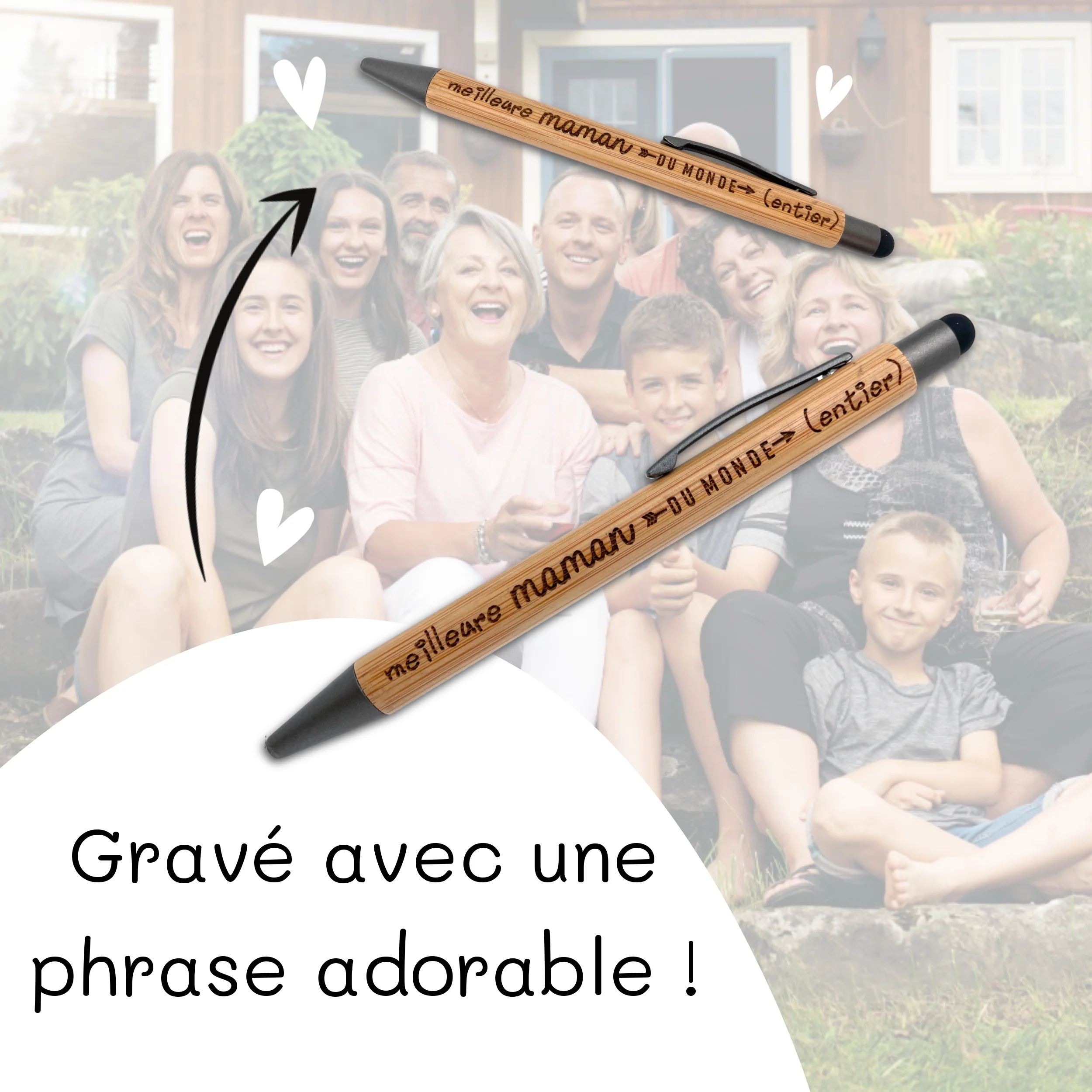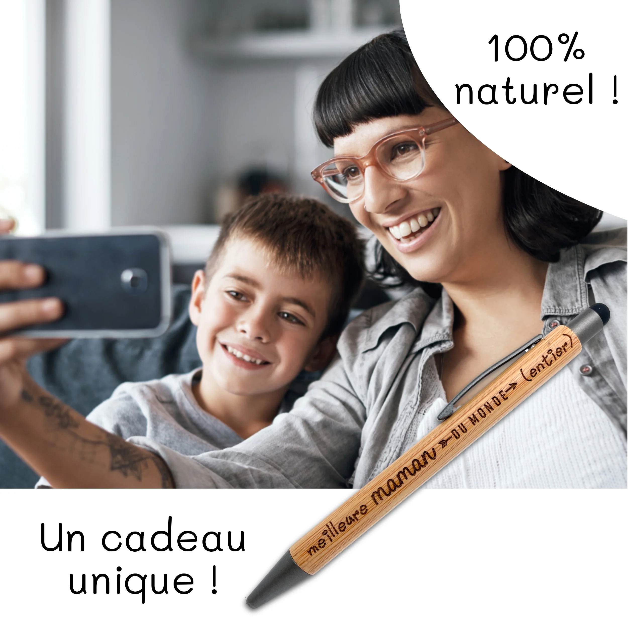 - 💖 STYLO MEILLEURE MAMAN 💖 : Ce superbe stylo tactile en bambou est gravé avec une phrase d’amour à l’attention de votre maman chérie ! Il sera utile pour écrire mais également pour parcourir les écrans multimédia grâce à son embout tactile. C’est LE CADEAU parfait pour faire plaisir à votre mère ou grand-mère!