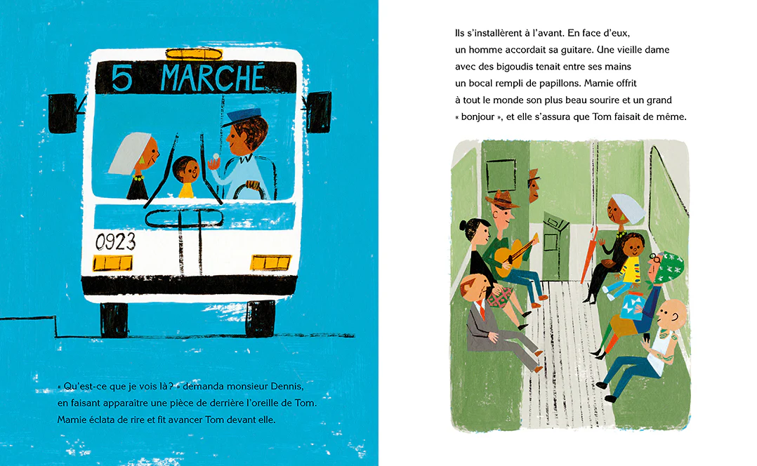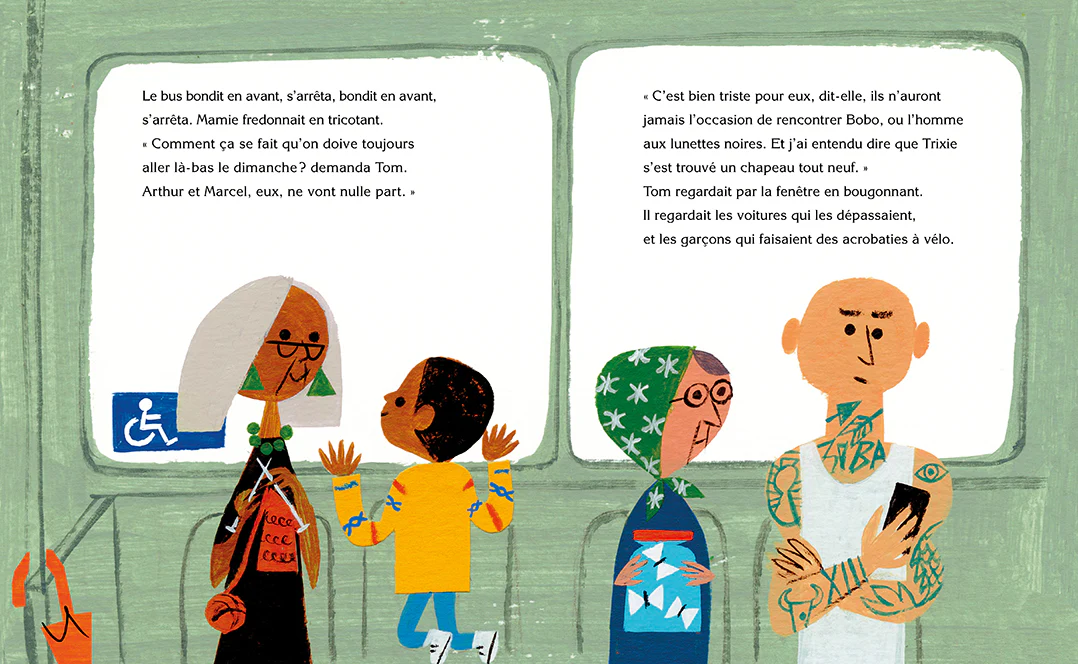 Chaque dimanche, Tom et sa mamie traversent la ville en bus, jusqu’au terminus. Mais aujourd’hui, Tom traîne des pieds. Pourquoi doit-il attendre le bus sous la pluie ? Pourquoi doit-il toujours aller là-bas ? Pourquoi certains ont ceci ou cela et pas lui ?