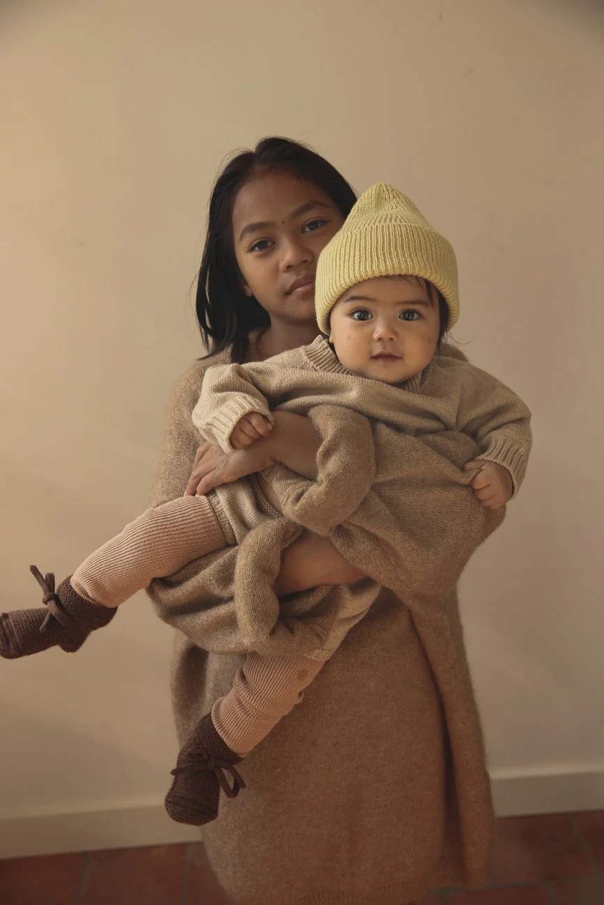 Hvid est né du cœur de la créatrice Caroline Camerlynck dans le désir d’offrir des produits de qualité pouvant être chéris par les familles des années durant. Les précieux textiles Hvid, faits de merinos, sont fabriqués de manière écologique dans un petit atelier familial en Belgique. Hvid signifie blanc en danois: chaque motif que vous tenez près de vous a d’abord été réalisé en blanc pur pour ensuite être teints avec des teintures naturelles. Ce procédé permet de créer des tricots au design impeccable et luxuriant incroyablement douillets.