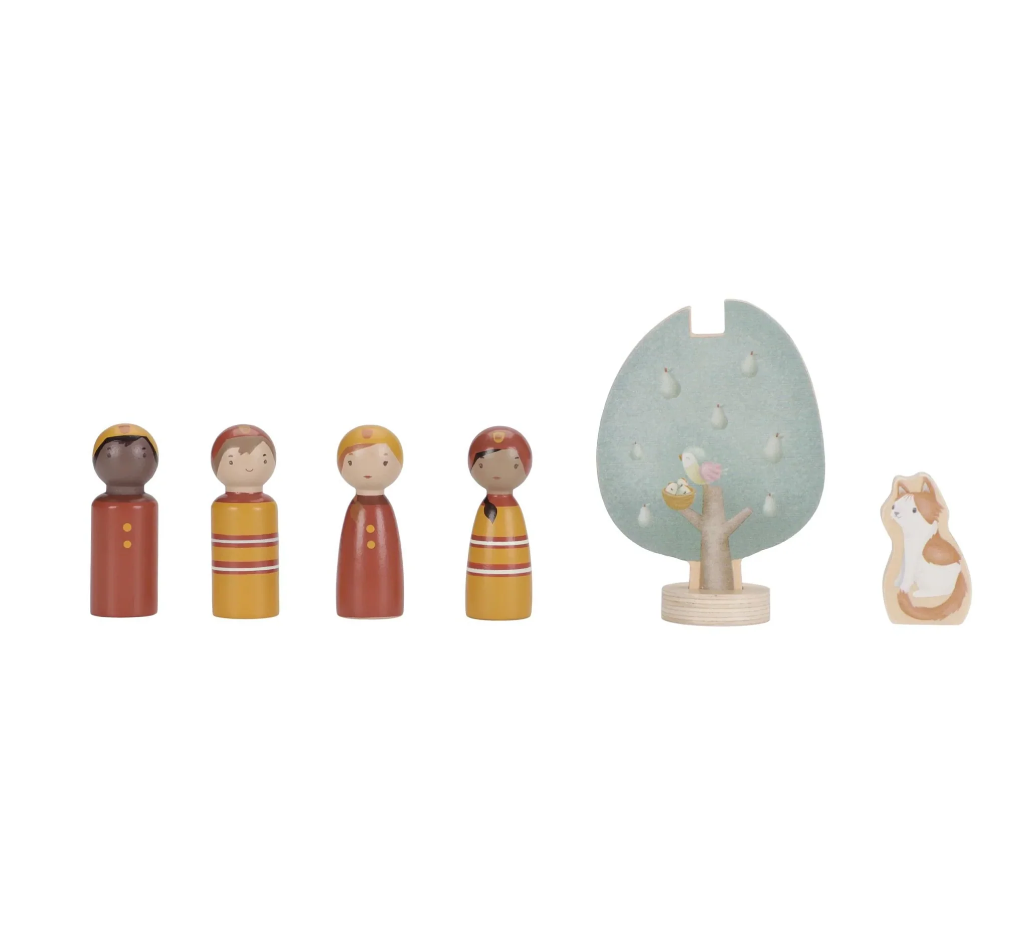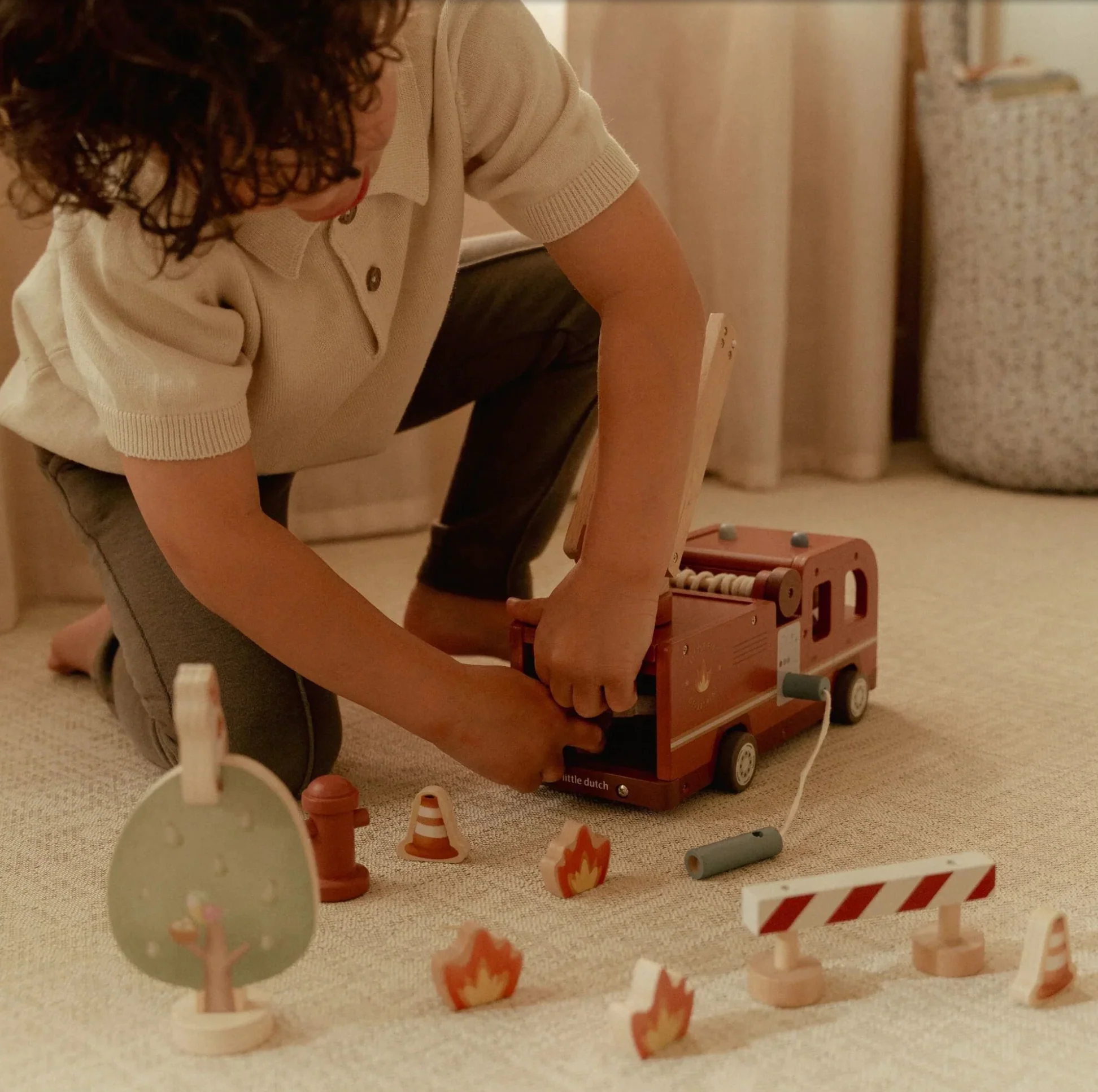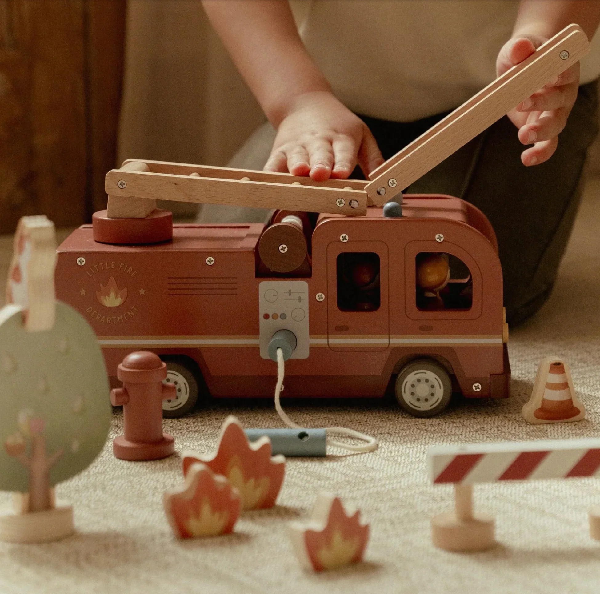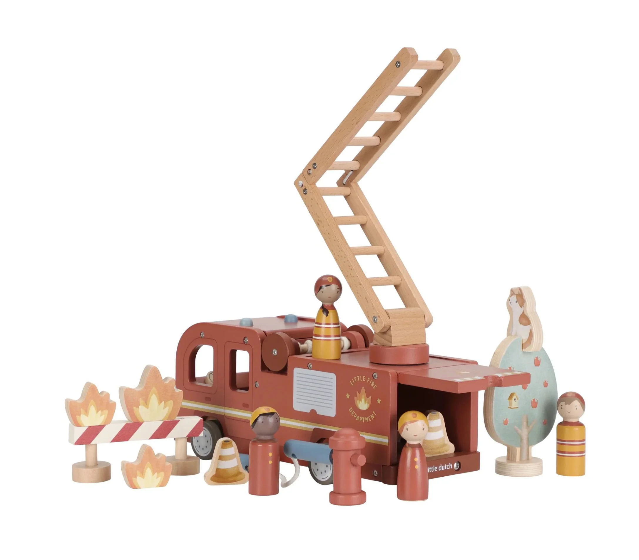 Sortez le chat de l’arbre ! Ce camion de pompiers en bois est équipé d’une échelle extensible et d’un tuyau amovible que vous pouvez raccorder à la borne d’incendie ou au camion de pompiers. Comprend quatre pompiers, des flammes et une borne d’incendie. Parfait pour se créer des histoires !