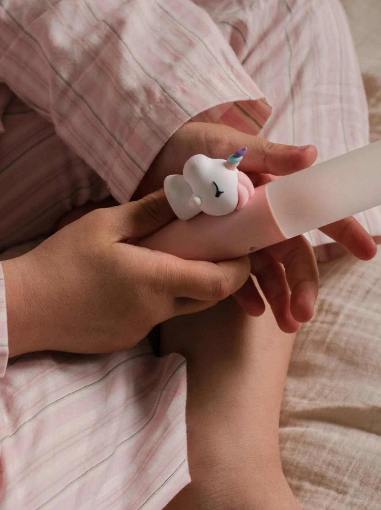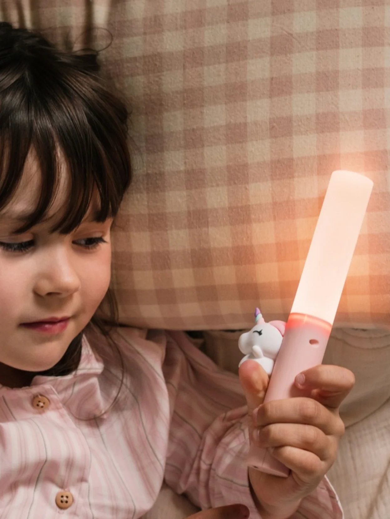 Avec son design de licorne féerique, sa texture douce en silicone et son format adapté aux enfants, elle est facile à manipuler. Grâce à son support mural magnétique, vous pouvez l’accrocher près du lit ou d’un coin lecture et la décrocher facilement pour l’emporter partout avec vous.