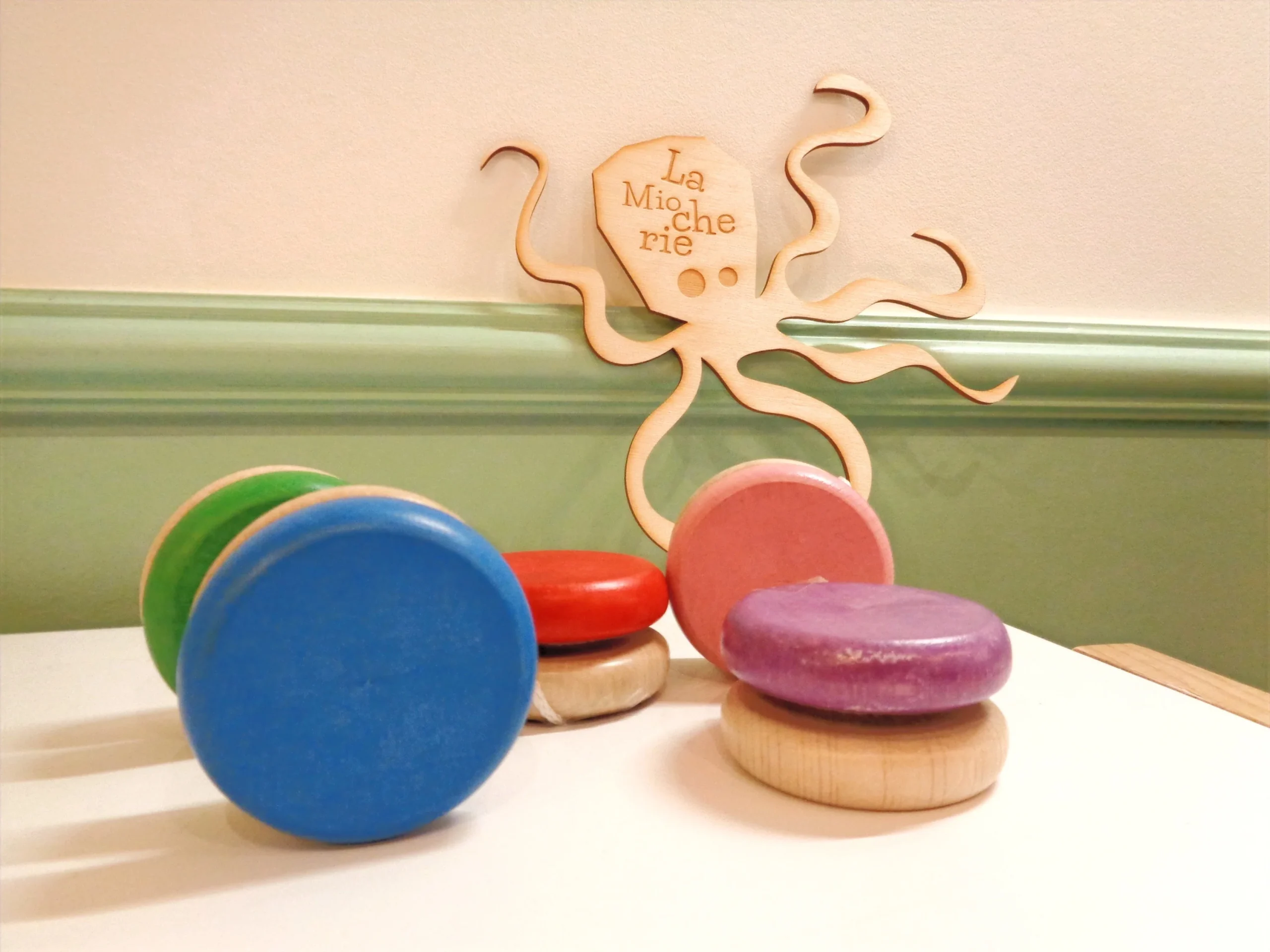 Ces jolis yoyos bombés en bois ont une partie en bois naturel et l’autre laquée et colorée. Leur diamètre est de 55mm, une taille standard pour les yoyos. Fabriqués en France, ce sont des indémodables !